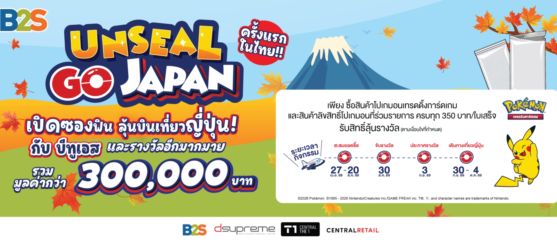 เพียงช้อปสินค้าโปเกมอนเทรดดิ้งการ์ดเกม และสินค้าลิขสิทธิ์โปเกมอนที่ร่วมรายการ ที่ร้าน B2S ทุกสาขา และเว็บไซต์ b2s.co.th