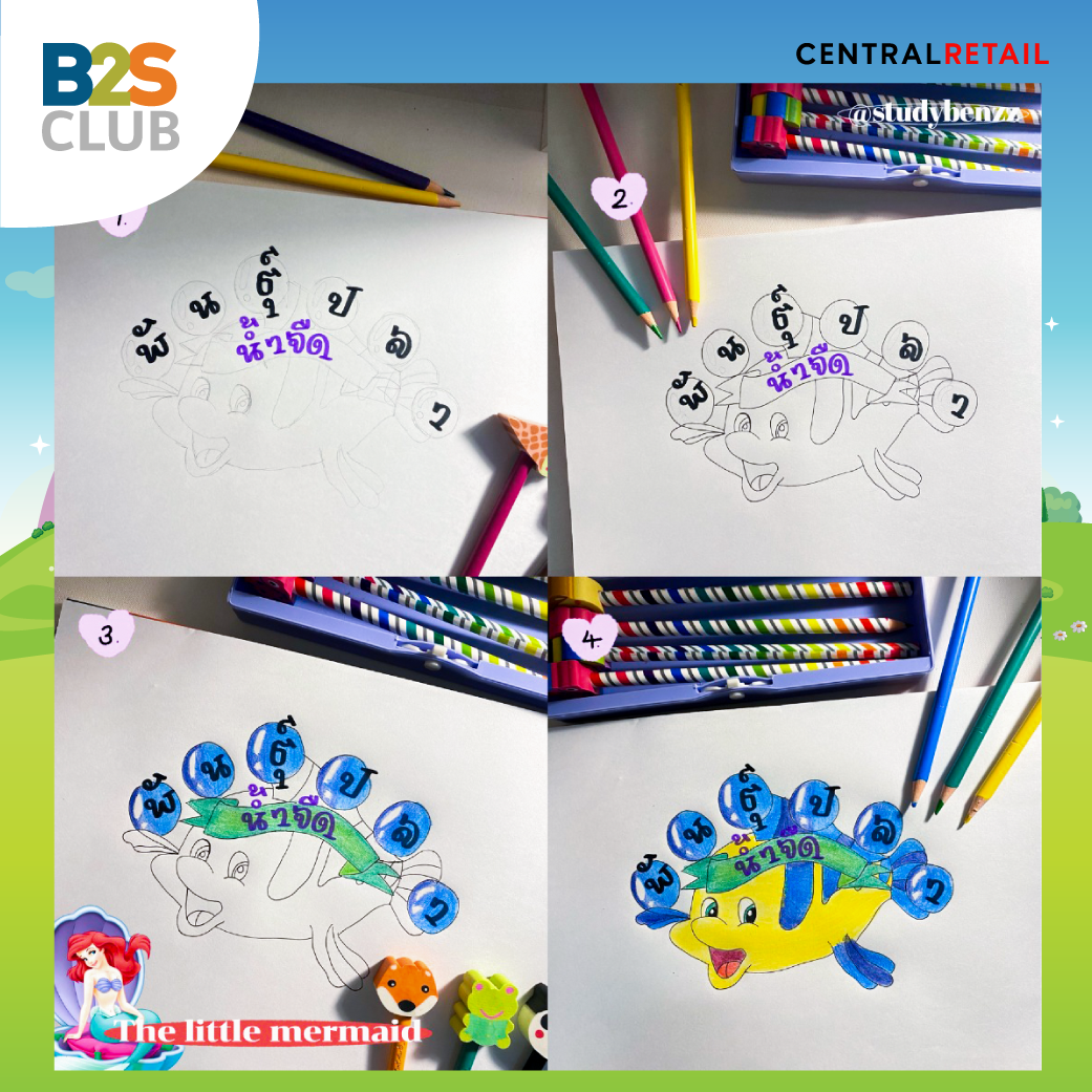 ธีม The little mermaid เลือกตัวละครสุดน่ารักอย่างเจ้าปลาฟลาวเดอร์ เพื่อนรักเจ้าหญิงแอเรียล เข้ากันดีกับหัวข้อ “พันธุ์ปลาน้ำจืด” ใช้ฟองอากาศใต้น้ำเป็นกรอบล้อมตัวอักษรของหัวข้อ ลงสีให้เรียบเนียน สมจริง