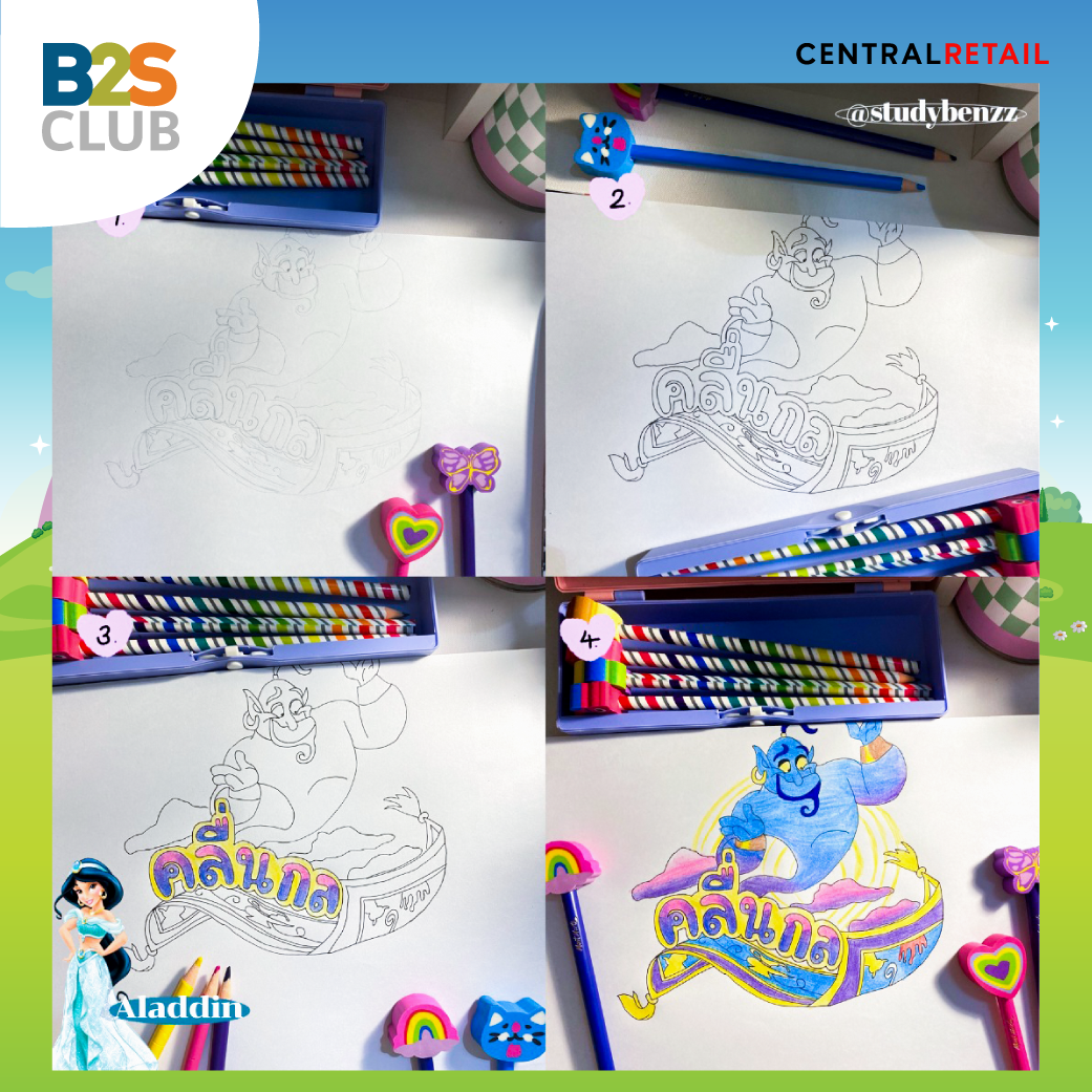 ปิดท้ายด้วยตัวละครจากเรื่อง Aladdin จีนี่กับพรมวิเศษ ใช้สีม่วง น้ำเงิน และเหลือง เข้ากันอย่างดี ไล่สีอ่อนเข้มด้วยสีไม้คุณภาพสูง เม็ดสีแน่น เนื้อเนียนนุ่มเกลี่ยง่าย หากกำลังมองหาสีไม้คุณภาพดีอยู่ละก็ ขอแนะนำ Montmarte ดินสอสีไม้ 2 หัว 24 ด้าม หลากหลายเฉดสีให้เลือกใช้จุใจ สั่งซื้อได้ที่นี่ คลิก