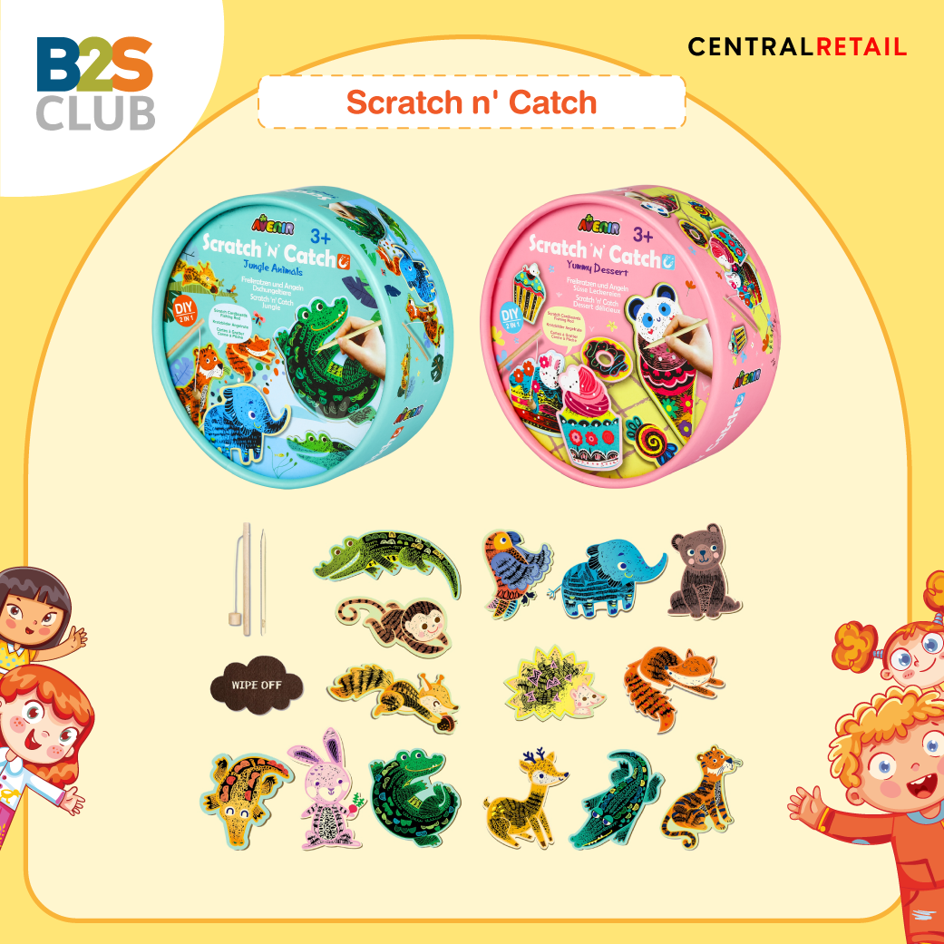 แค่เห็นกล่องก็น่าเล่นแล้ว เจ้า Strach N Catch จะเป็นแม่เหล็กรูปสัตว์ และคัพเค้ก ที่สามารถ ขูด ๆ วาด ๆ ตกแต่งได้ตามใจ เหมาะกับเด็กอายุ 3 ปีขึ้นไป หลังจากวาดเสร็จ สามารถนำมาเล่นเป็นเกม โดยใช้คันเบ็ดที่มีมาให้ในกล่อง ตกเจ้าสัตว์ต่าง ๆ เพื่อแข่งกันว่าใครได้คะแนนเยอะว่ากัน (ใต้ท้องของแต่ละชิ้นจะมีตัวเลขอยู่) ช่วยนอกจากจะเสริมพัฒนาการเรื่องศิลปะแล้วยังช่วยสอนเรื่องคณิตศาสตร์ด้วย แบบนี้ไม่ซื้อไม่ได้แล้ว
