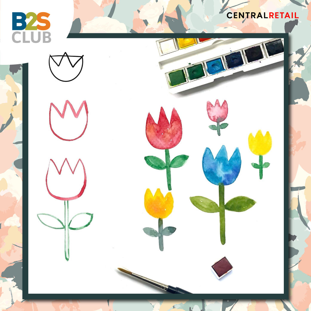 ถัดไป ลองวาดดอกทิวลิปแบบง่าย ๆ ด้วยการวาดครึ่งวงกลมก่อนที่จะใส่เส้นหยักทับตรงปลาย เติมก้าน ใส่ใบ แค่นี้ก็ได้ดอกทิวลิปสุดน่ารัก การลงสีก็ไม่ยุ่งยาก วาดด้วยสีอะไร ระบายด้วยสีที่วาดเลย ไม่ว่าจะสีแดง สีฟ้า สีเหลือง ก็สดใสสะดุดตา