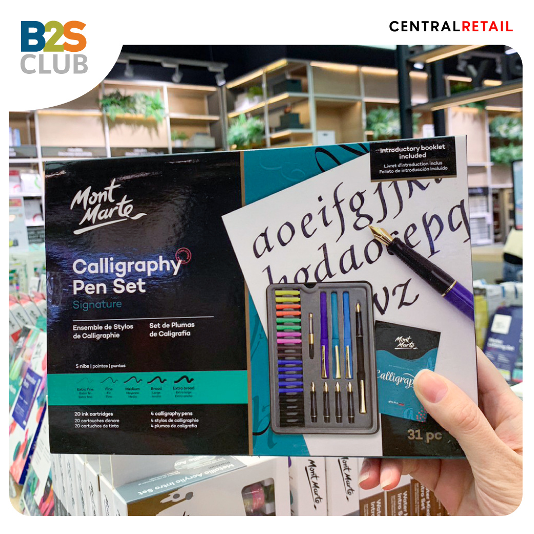 ชุดปากกา Calligraphy MONT MARTE สำหรับฝึกการเขียนอักษรวิจิตร เป็นศิลปะการเขียนอักษรงดงามที่ต้องอาศัยการฝึกฝนอย่างสม่ำเสมอ ในเซ็ตประกอบด้วย ปากกา 5 ขนาด ตลับหมึก 20 ตลับ