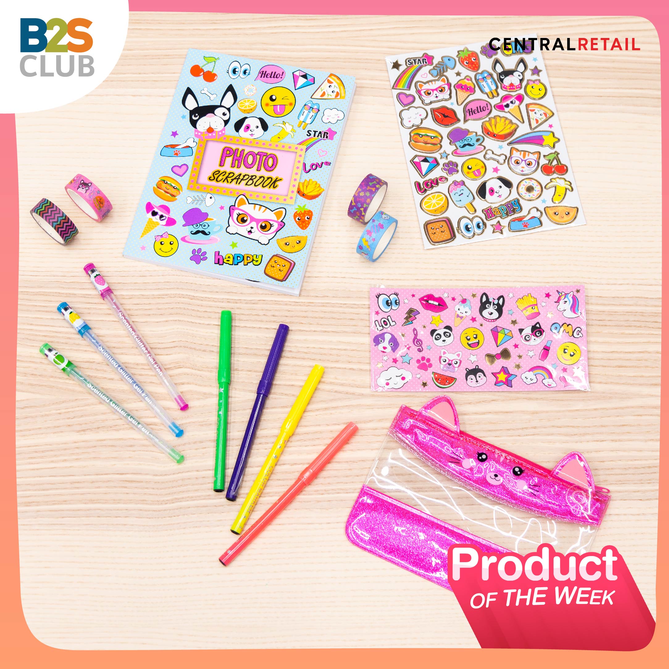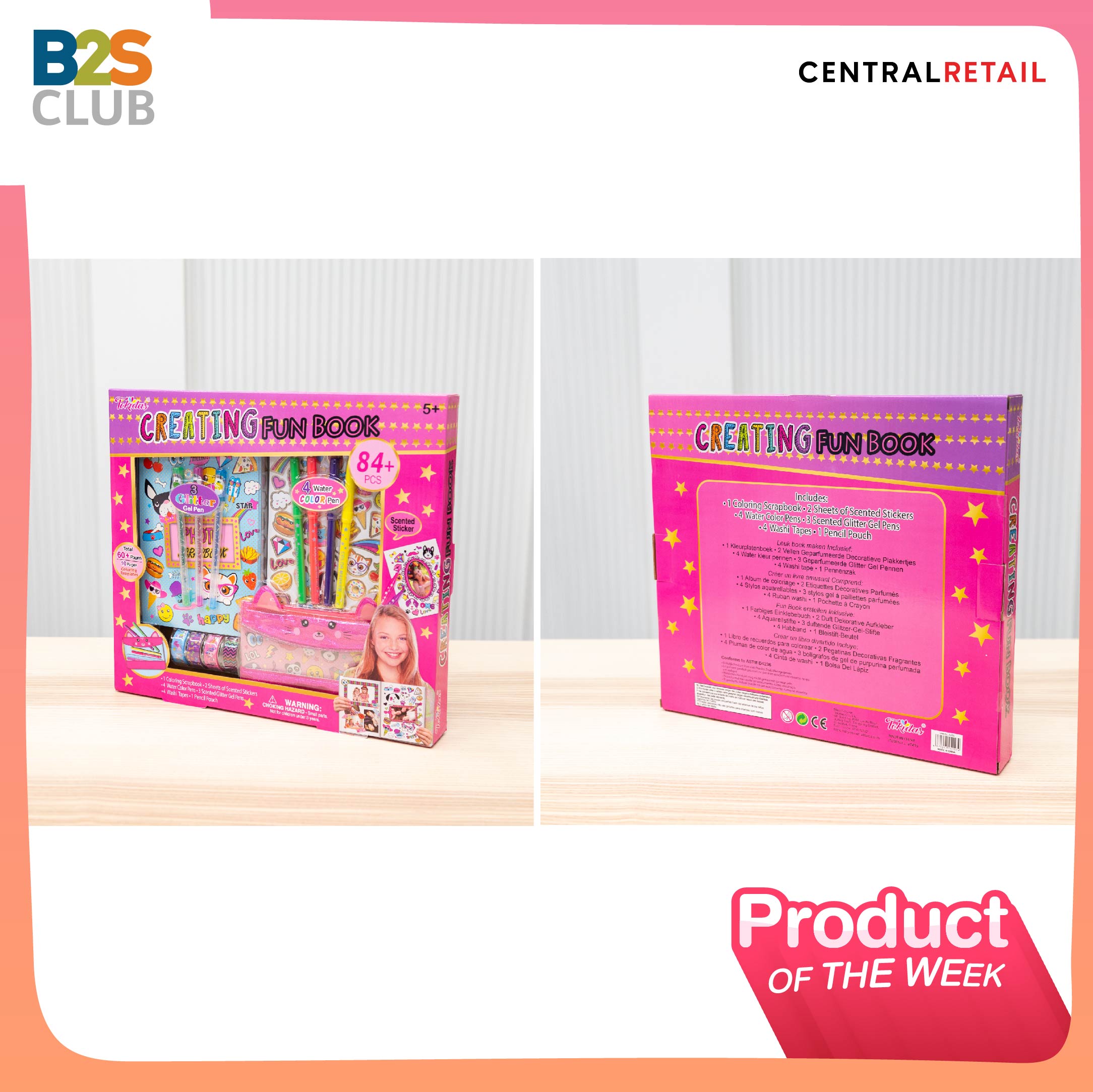 What: Creating Fun Book เซ็ตสมุดบันทึก Scrapbook และอุปกรณ์เครื่องเขียน พร้อมของตกแต่ง ภายในเซ็ตประกอบด้วยสมุด Scrapbook 1 เล่ม ปากกาเจลสีกลิตเตอร์กลิ่นหอม 3 แท่ง ปากกาเมจิกสี 4 แท่ง กระเป๋่าดินสอ 1 ใบ สติ๊กเกอร์ตกแต่งที่มีกลิ่นหอม 2 แผ่น และวาชิเทป (Washi Tape) หรือเทปตกแต่ง ลวดลายต่างกัน 4 ม้วน ซึ่งด้านในสมุดจะมีส่วนหน้ากระดาษเปล่า 60 แผ่น และส่วนที่พิมพ์ลวดลาย 10 แผ่น ไว้ติดรูป ระบายสี หรือติดสติ๊กเกอร์ได้ตามชอบ