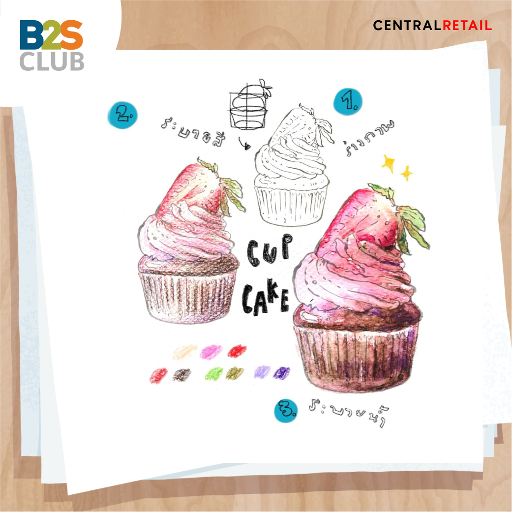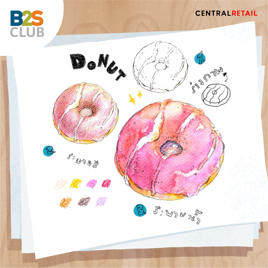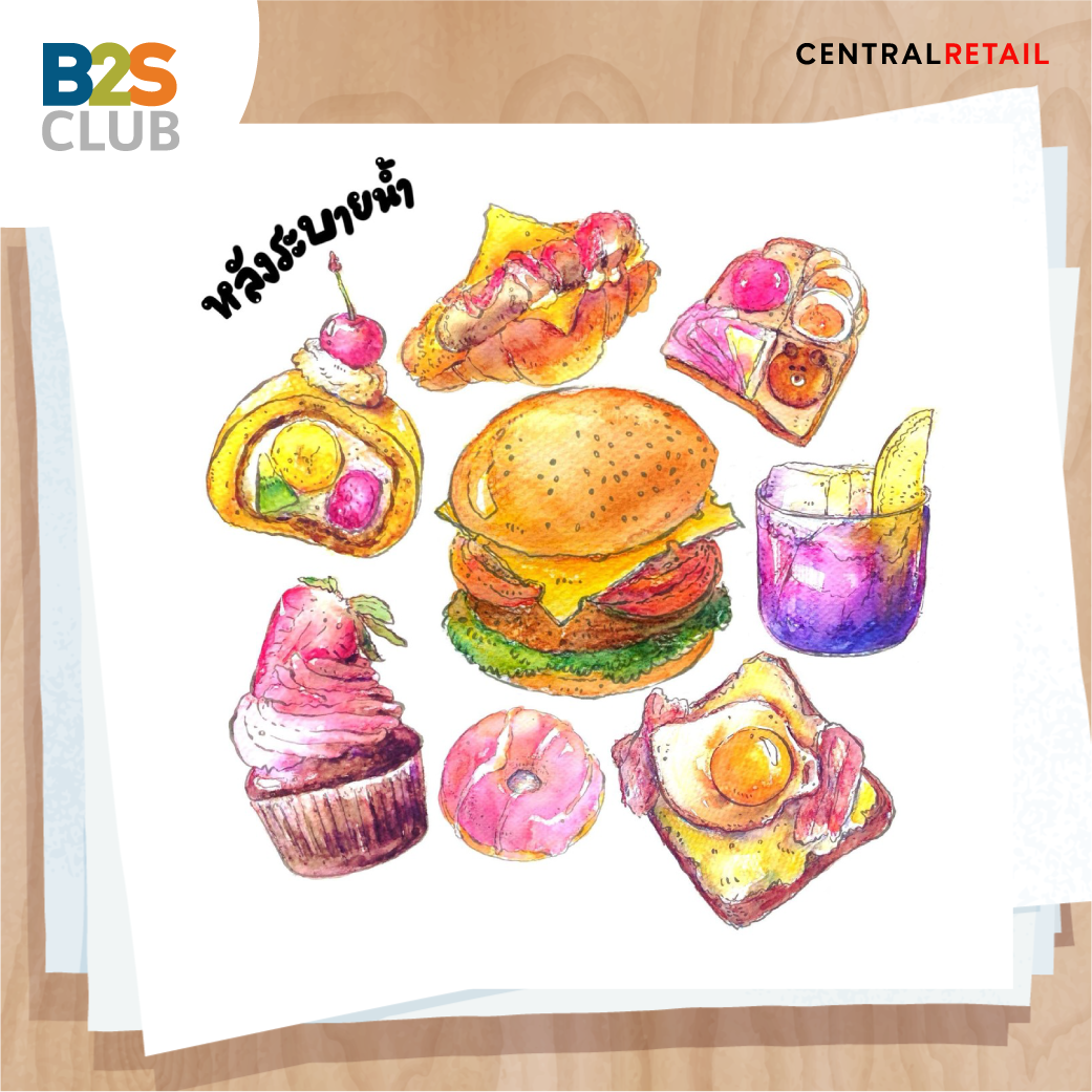 วันนี้ B2S CLUB ขอชวนทุกคนมาฝึกวาดอาหารและขนมง่าย ๆ ด้วยเทคนิคสีไม้ระบายน้ำ ที่จะทำให้อาหารของเราดูน่าทานขึ้น อุปกรณ์ที่ใช้ไม่ยุ่งยากเลย แค่มีสีไม้ระบายน้ำ ซึ่งคุณสมบัติของสีไม้ระบายน้ำที่ดี คือเมื่อระบายน้ำแล้วสียังคงสด ชัด ระบายง่าย ไม่ทิ้งคราบ