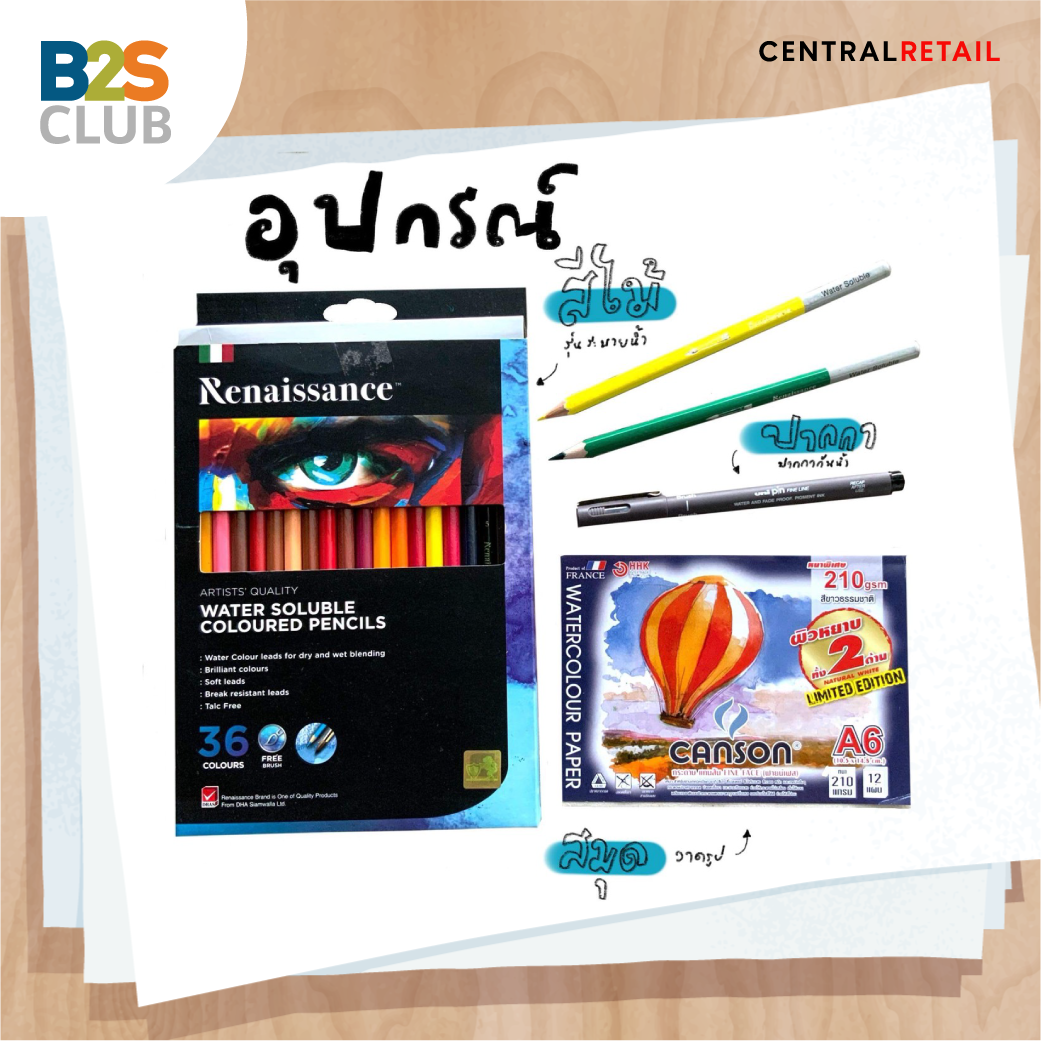 จากตัวอย่างเราเลือกใช้สีไม้ระบายน้ำของ Renaissance รุ่น Water Soluble Coloured Pencils ซึ่งมีเนื้อสีสดชัด ระบายนุ่ม สีละลายน้ำง่าย ไม่จืดเมื่อแห้ง มีพู่กันแถมมาให้ภายในกล่อง ราคาหลักร้อย แต่ทุกคนสามารถหาสีไม้ระบายน้ำตามงบประมาณและความชอบหลากหลายได้ ที่นี่