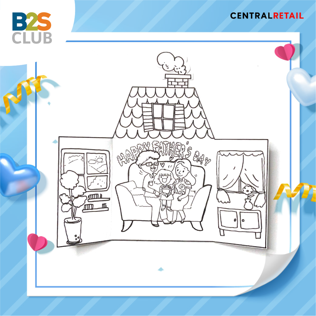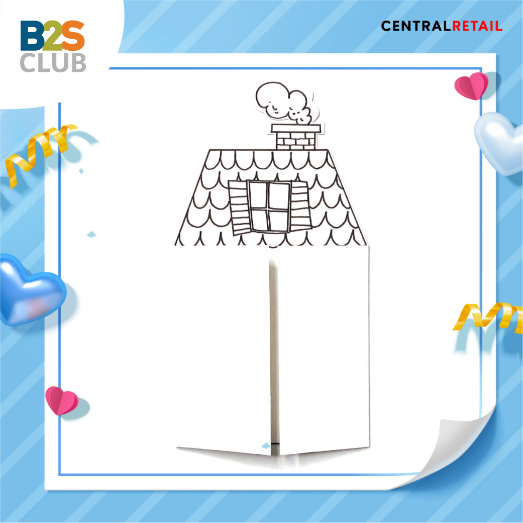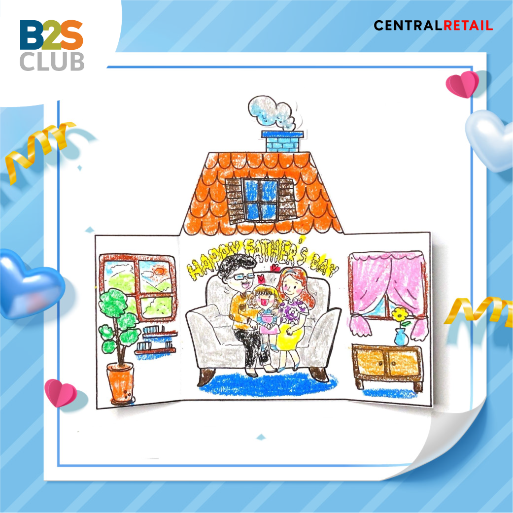 เมื่อวาดภายนอกบ้านเสร็จแล้ว มาออกแบบภายในการ์ดต่อ ขั้นตอนนี้แล้วแต่เพื่อน ๆ จะสร้างสรรค์จินตนาการ อาจจะวาดคุณพ่อ คุณแม่ คุณลูก นั่งเล่นกันบนโซฟา พร้อมกับบรรยากาศอบอุ่นภายในบ้าน ตามแต่สไตล์ของแต่ละคน