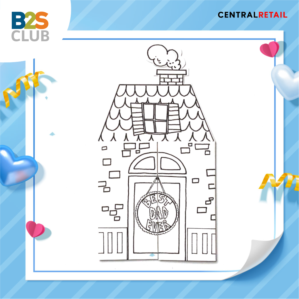 เมื่อได้แบบการ์ดบ้านแล้ว ก็เริ่มวาดตกแต่งตามความชอบได้เลย ตัวอย่างนี้จะวาดคล้ายกับหน้าบ้าน มีประตู หน้าต่าง และรั้วเล็ก ๆ ตรงกลางประตู ติดป้ายข้อความน่ารัก ๆ ที่สื่อถึงคุณพ่ออย่าง “BEST DAD EVER” พ่อที่ดีที่สุด