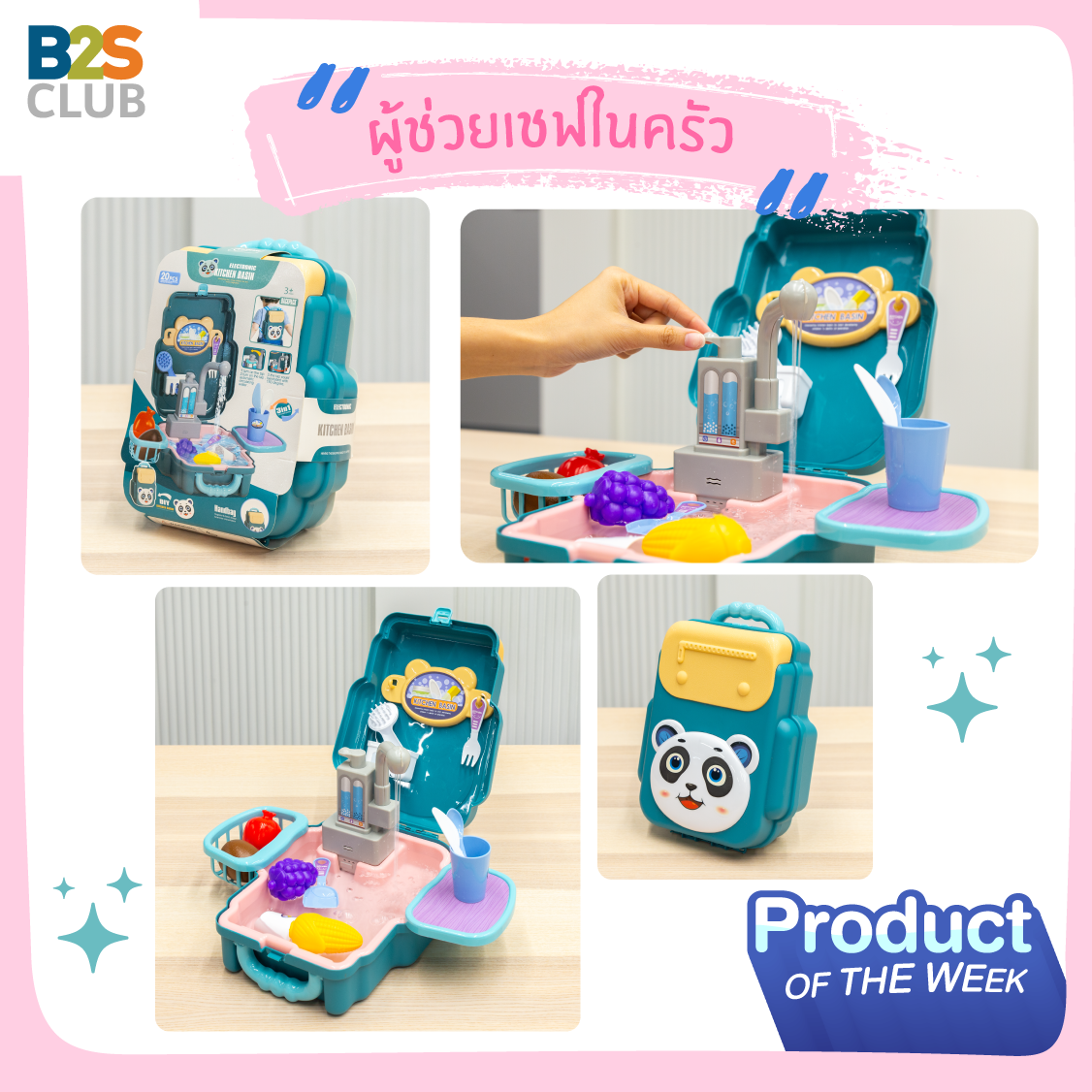 กล่องนี้ไม่ธรรมดา เพราะสามารถเปิดก๊อกน้ำล้างจานได้เสมือนจริง รับประกันความสนุกของเด็ก ๆ เพียงใส่ถ่านเครื่องปั๊มน้ำ และเติมน้ำให้พอดีขอบที่เครื่องจะสามารถดูดน้ำได้ ปลอดภัยหายห่วงเพราะตัวถ่านอยู่ในวัสดุปิดมิดชิด และแบ่งส่วนไม่โดนน้ำ อุปกรณ์ล้างจานสุดล้ำ ฝึกวินัยให้เด็ก ๆ เรียนรู้งานบ้านอีกทางหนึ่ง กลอ่งนี้สามารถติดสายสะพายพกพาติดตัวไปด้วยได้