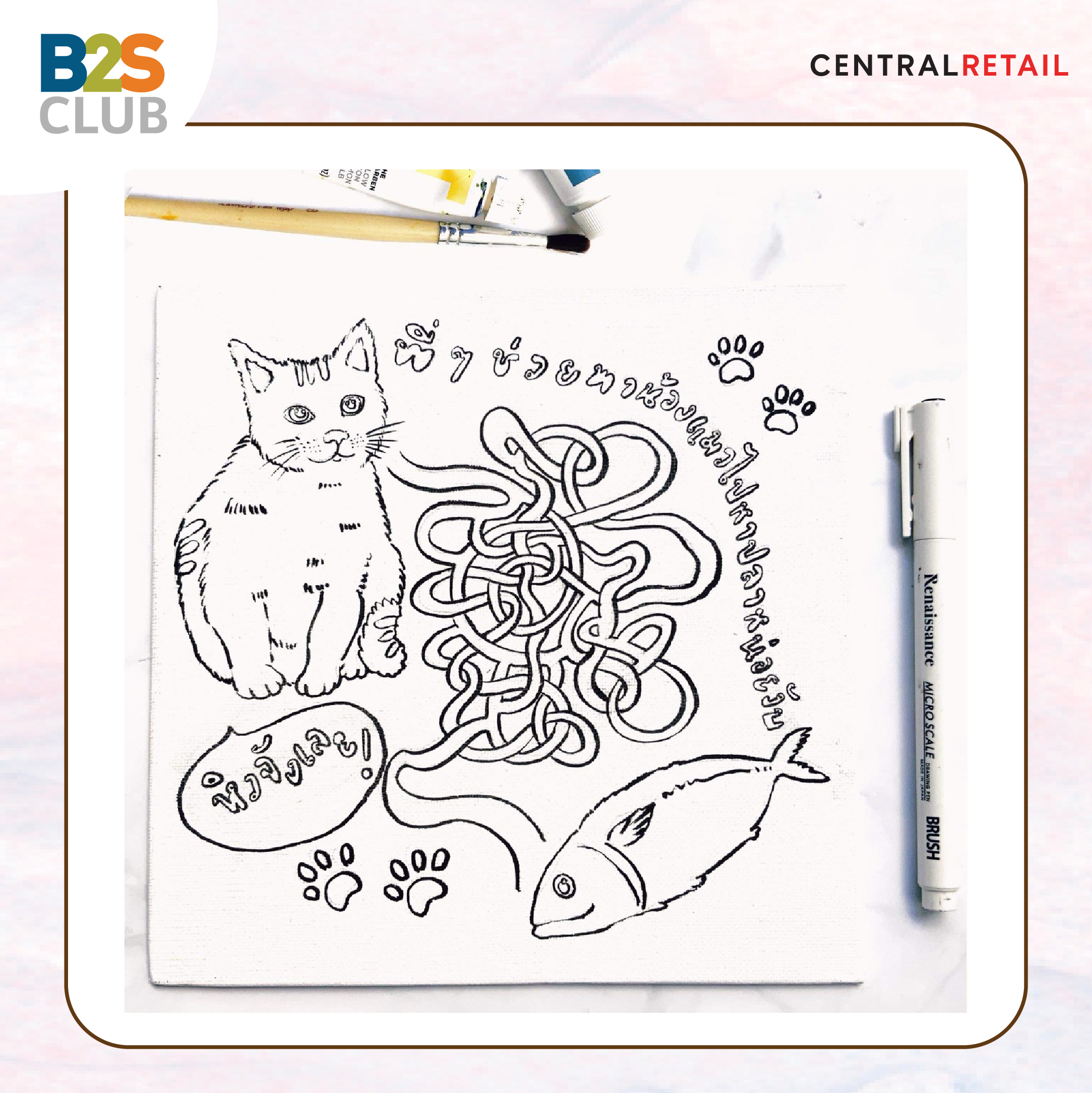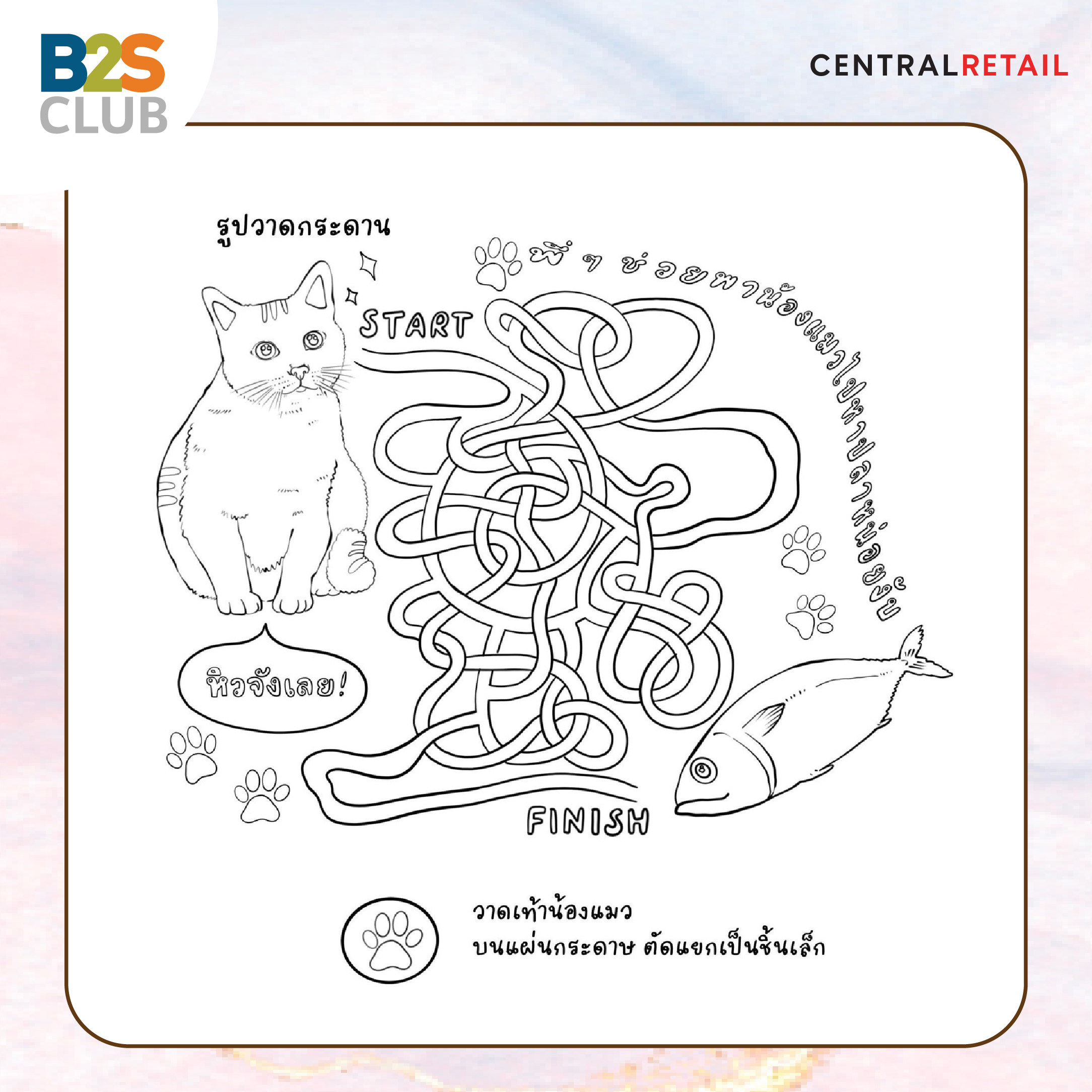 เตรียมแบบ ร่างภาพเกมกันก่อน เกมนี้เรียกง่าย ๆ ว่าเกมเขาวงกต ต้องหาเส้นทางที่น้องแมวจะออกไปหาปลาได้ เพื่อน ๆ สามารถร่างตามภาพตัวอย่างเลย หรือปรับเปลี่ยนเส้นทางซับซ้อนได้ตามความต้องการ อาจจะลองสเก็ตช์บนกระดาษ หรือร่างด้วยดินสอก่อนจะช่วยป้องกันความผิดพลาดได้
