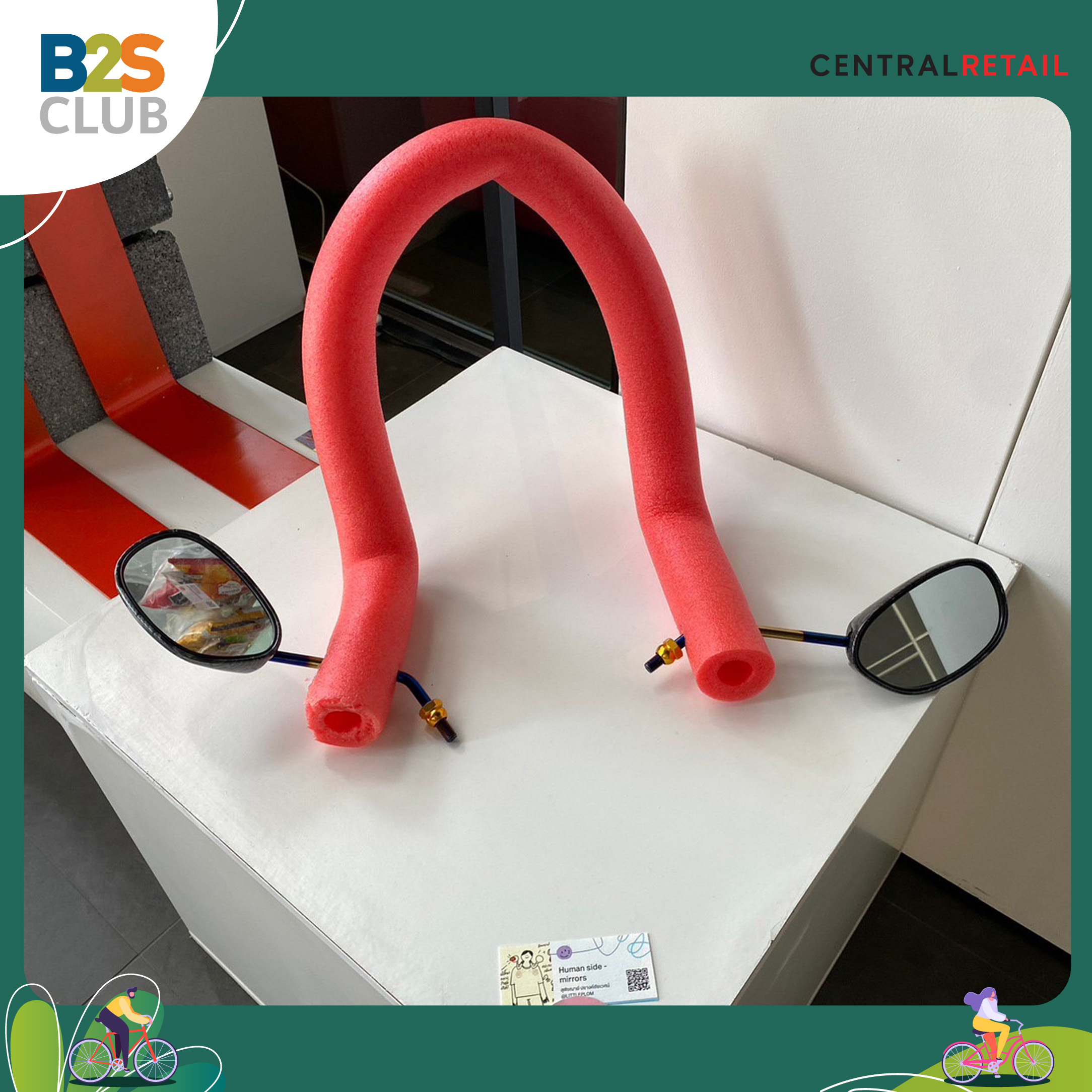 ผลงานหน้าตาสุดประหลาดนี้มีชื่อว่า “Human side – mirrors” ที่ผู้ประดิษฐ์ได้รับแรงบันดาลใจมาจากการเดินทางบนทางเท้าในพื้นที่ย่านเศรษฐกิจ มีซอยเล็กๆ ที่มีมอเตอร์ไซค์พลุกพล่าน ต้องคอยหันไประวังอยู่เสมอ