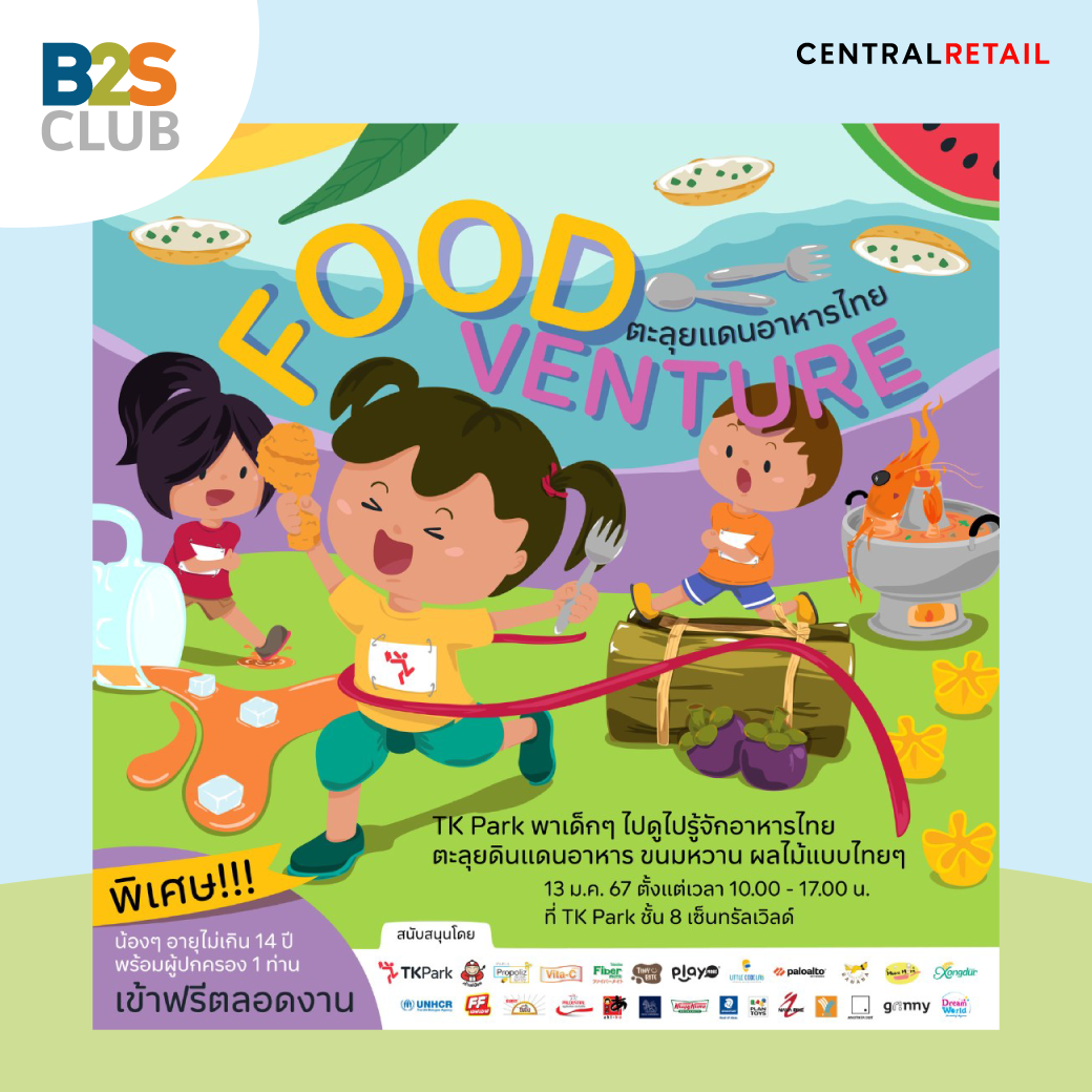 ชวนเด็กๆ มารู้จักอาหารไทย ผจญภัยไปกับดินแดนความอร่อย ที่งาน Food Venture พบกับกิจกรรมสนุกๆ หลากหลายในธีม “ตะลุยอาหารไทย” ไม่ว่าจะเป็นเกมสร้างสรรค์ สื่อสาระท้องถิ่น เพลิดเพลินกับการแสดงโชว์ความสามารถของหนูน้อยน่ารัก และบูธกิจกรรมจากผู้ใหญ่ใจดีที่มาพร้อมของขวัญ ของแจกมากมาย สำหรับเด็กๆอายุไม่เกิน 14 ปีกับผู้ปกครอง 1 ท่าน สามารถเข้าร่วมกิจกรรมที่ TK Park ฟรี!