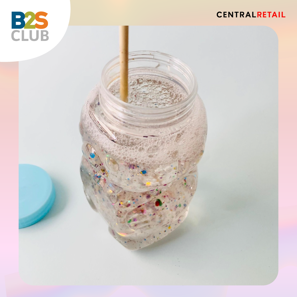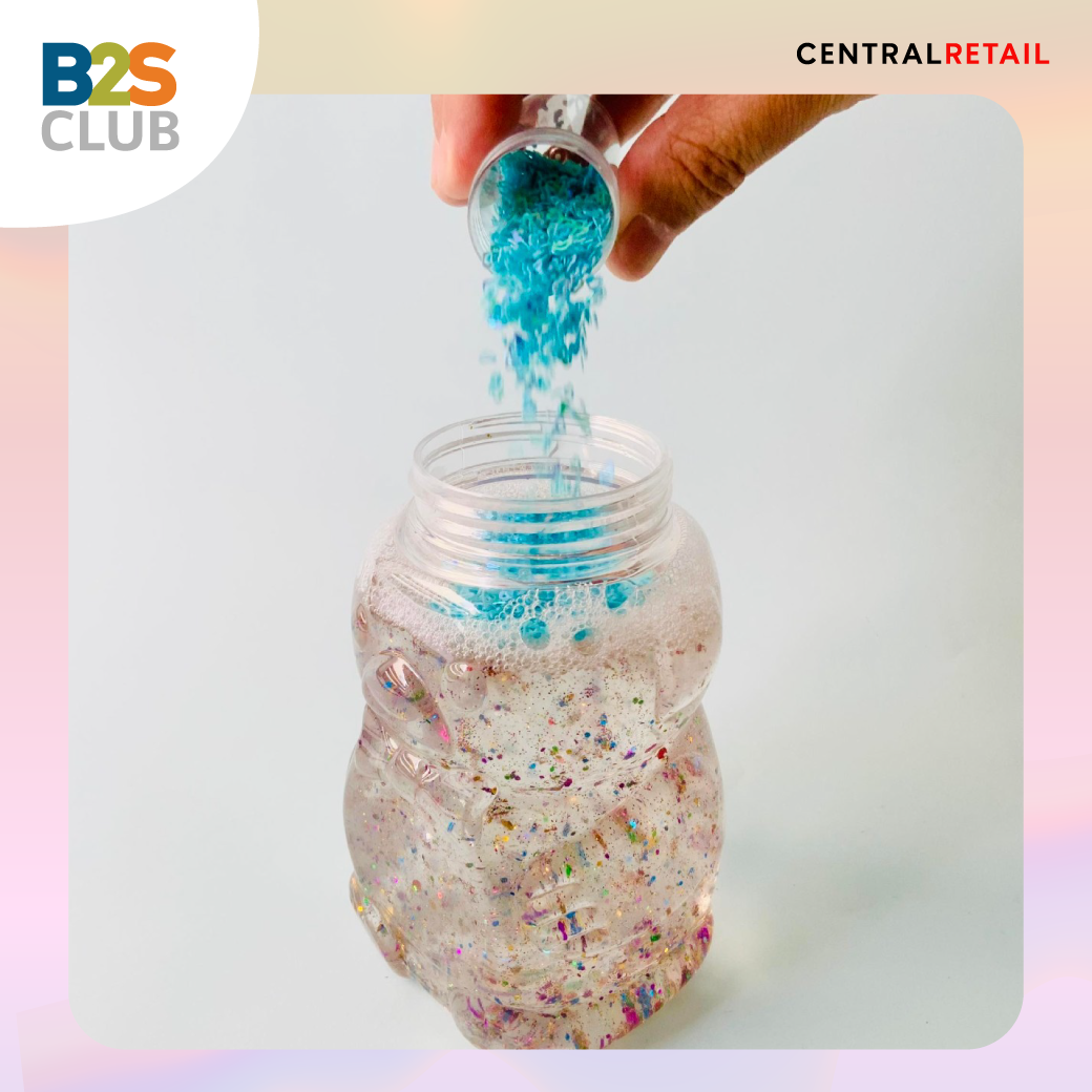B2S CLUB ชวนทำ“ขวดโหลกลิตเตอร์ฟรุ้งฟริ้ง” ที่จะมาเป็นตัวช่วยให้สติ และอารมณ์ดีๆ ของเด็กๆ กลับมา หลักการของมันก็คือ ขวดโหลจะเต็มไปด้วยกลิตเตอร์ลอยล่อง แล้วให้เด็กๆ ฝึกสมาธิโดยการเฝ้าดูแสงระยิบระยับ ที่เต้นระบำในขวดจนกว่าน้ำจะนิ่งหยุดลง ระหว่างที่จ้อง เด็กจะค่อยๆ รู้สึกผ่อนคลาย สงบ สามารถโฟกัสและเรียกสมาธิให้กลับมาได้