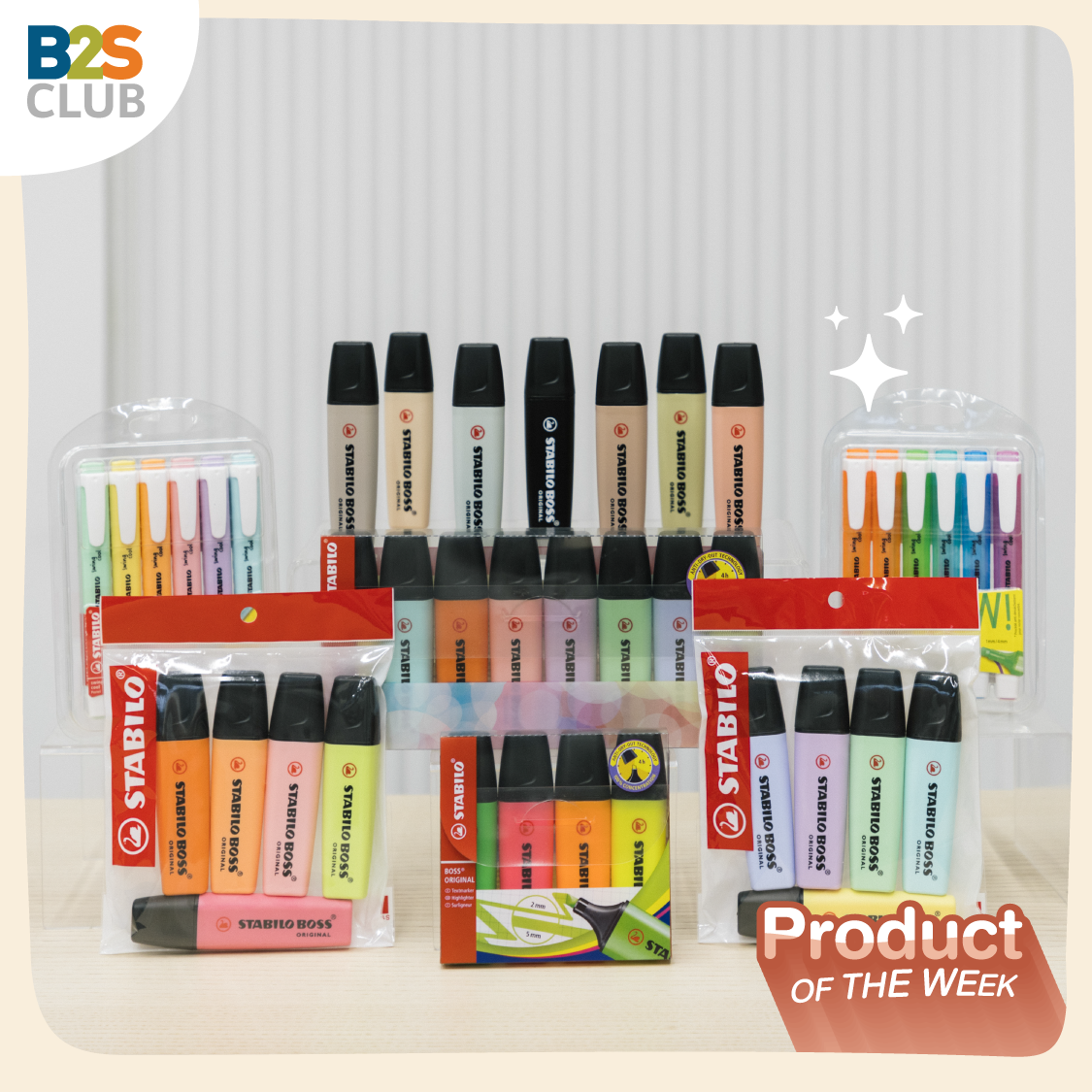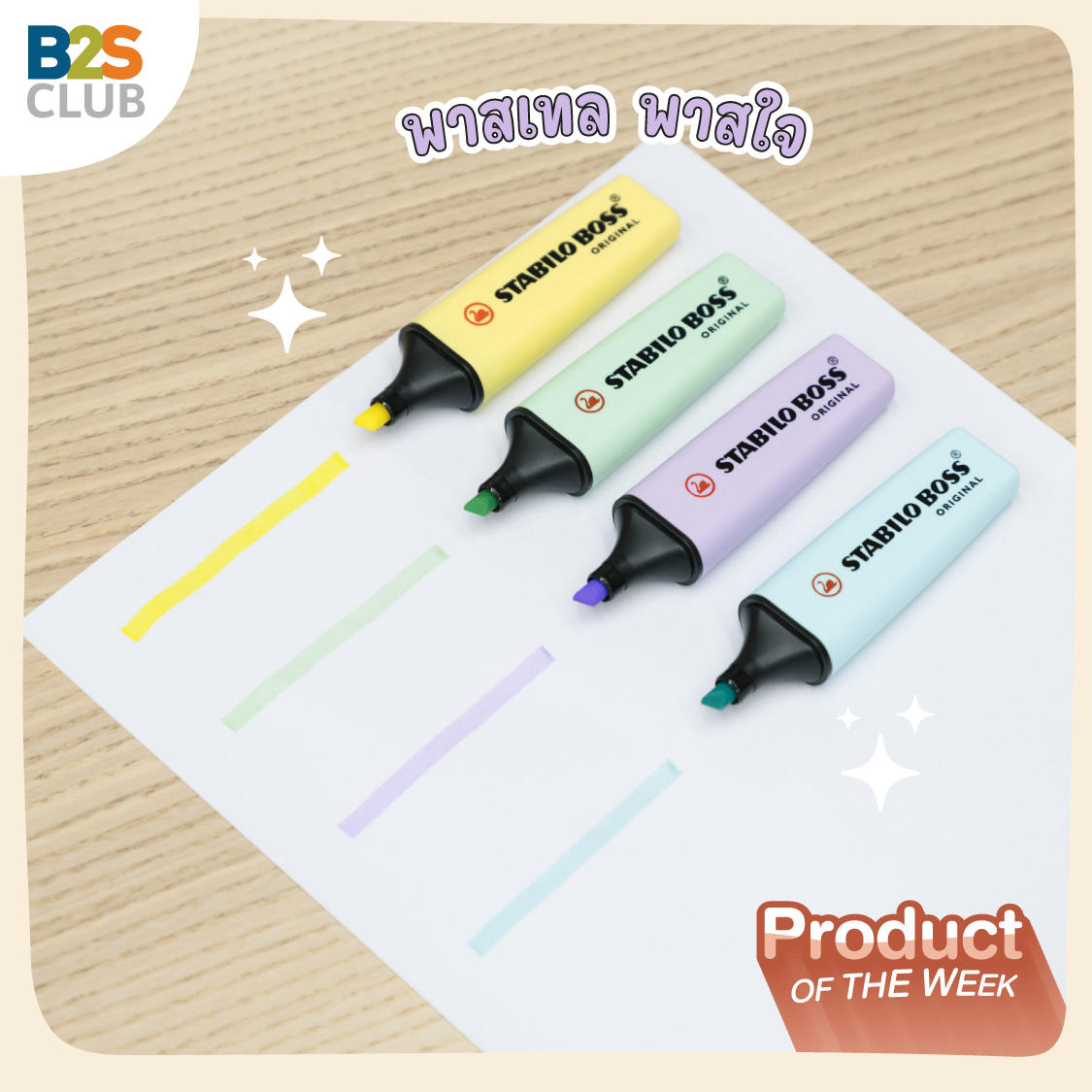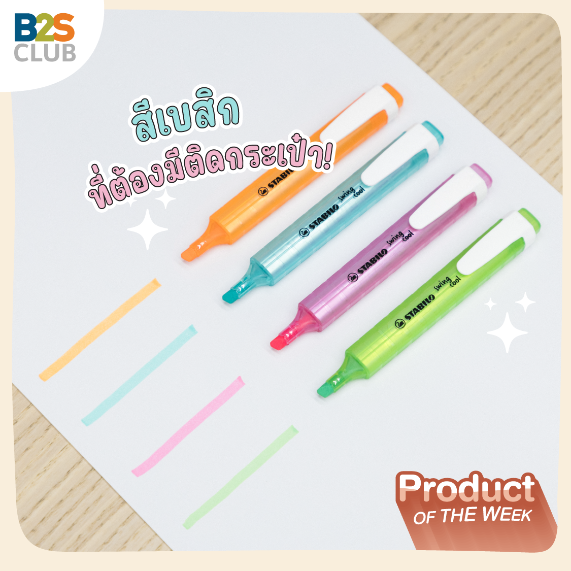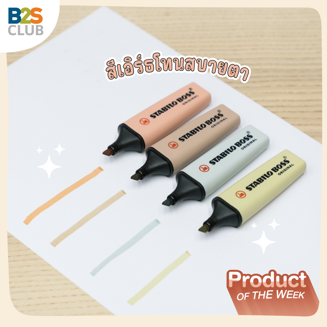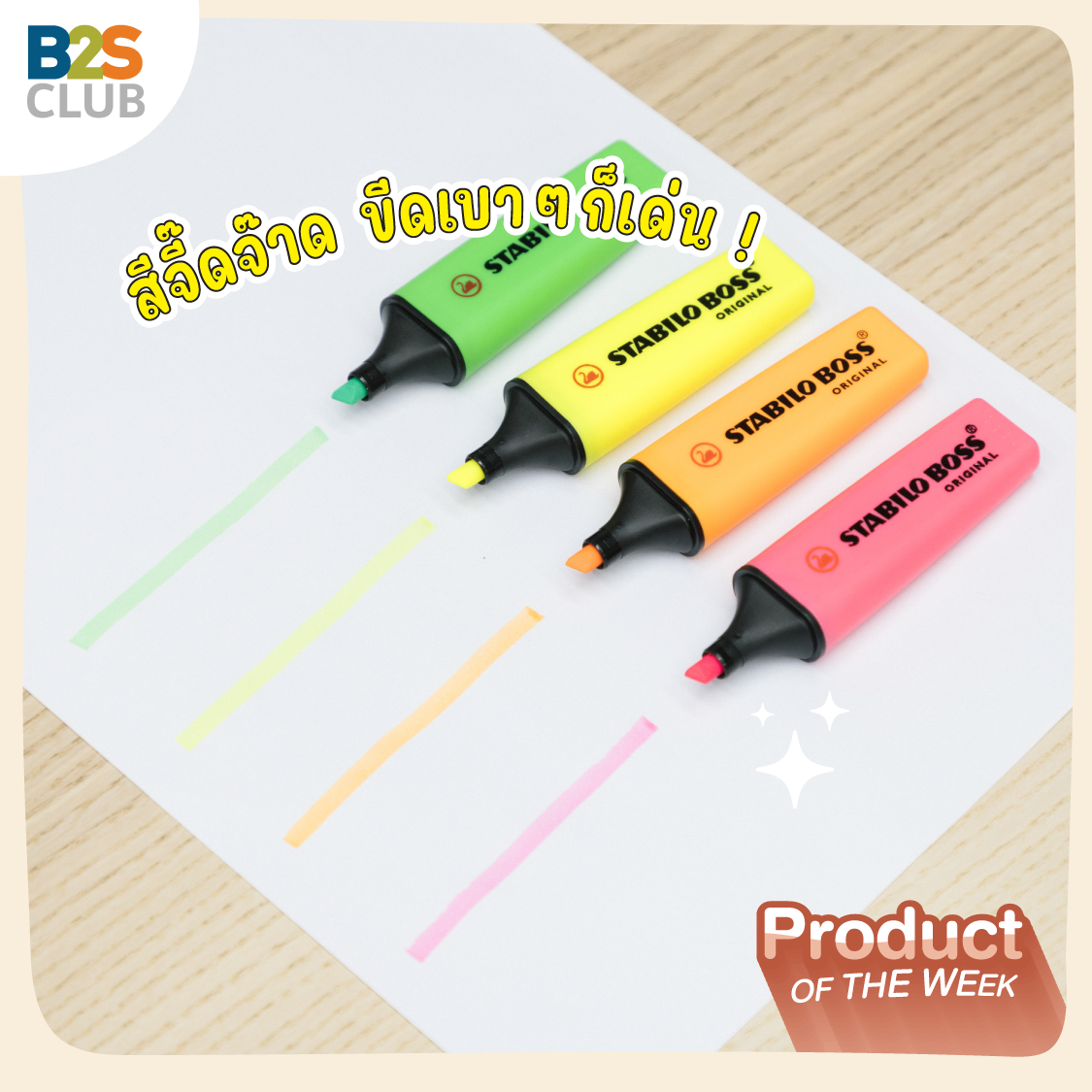 Why: ปากกาเน้นข้อความที่การันตีคุณภาพระดับโลก มาพร้อมเทคโนโลยีมากมายที่ตอบโจทย์ผู้ใช้งานสุดๆ ไม่ต้องกังวลเรื่องหมึกปากกาแห้งไว เปิดฝาทิ้งไว้ 4 ชั่วโมงก็ยังเน้นข้อความได้ชัด! ที่สำคัญ เค้าดีไซน์หัวปากกาโดยใช้พลาสติก ข้อดีคือหัวจะไม่บานเลย เมื่อเทียบกับหัวแบบสักหลาดที่ใช้งานไปไม่นานก็จะบานและใช้งานไม่สนุกแล้ว รอบนี้ B2S CLUB ขนมาให้เลือกหลายเฉดสี สวยทันสมัยมาก จะโทนสีพื้นฐานสุดจี๊ดจ๊าดที่เราคุ้นตากันก็มี  หรือสีแนวเอิร์ธโทน มินิมอล พาสเทลก็มา เลือกได้ตามใจชอบ สีสันที่ใช่ จะทำให้เราจด เรียน เขียน สนุกขึ้นแน่นอน
