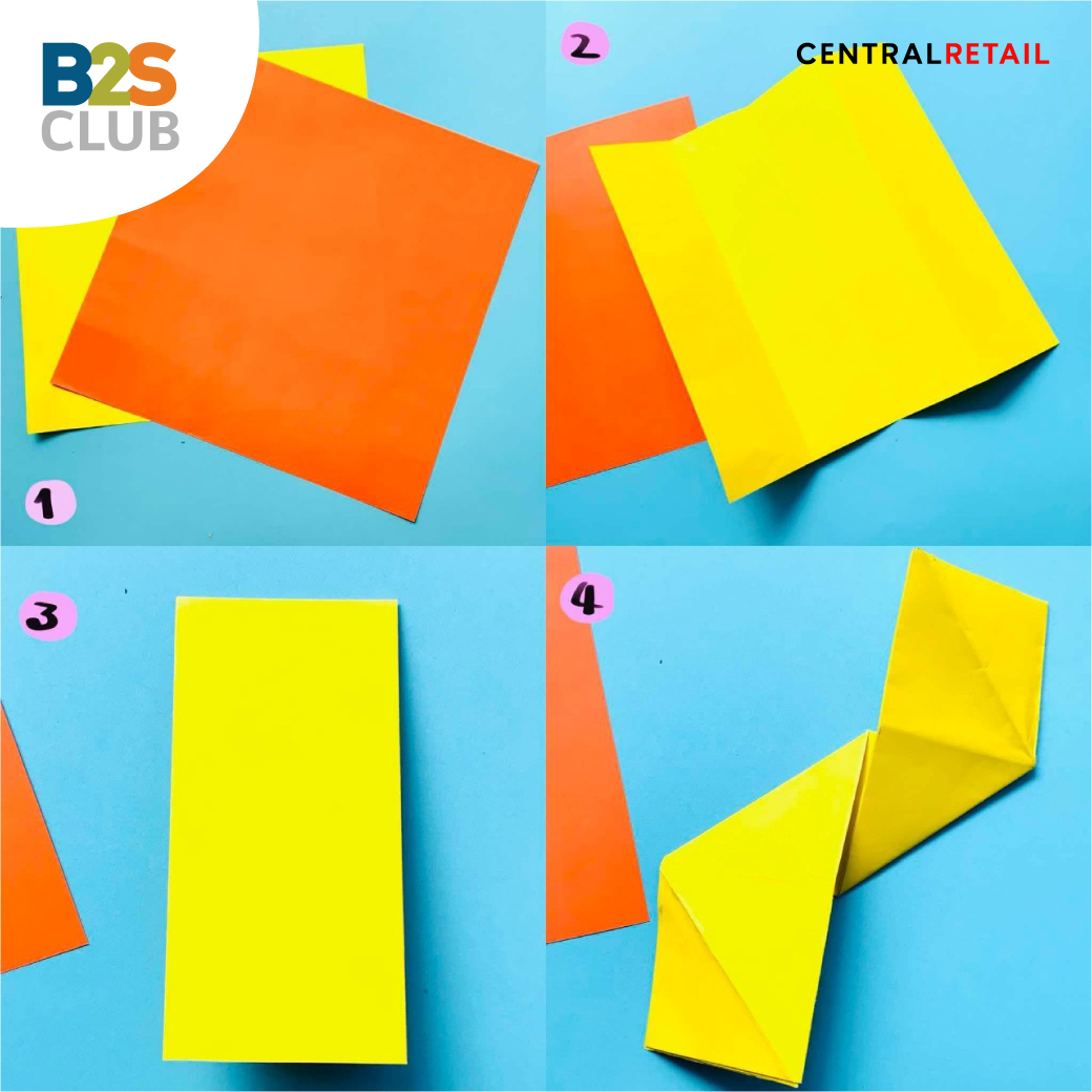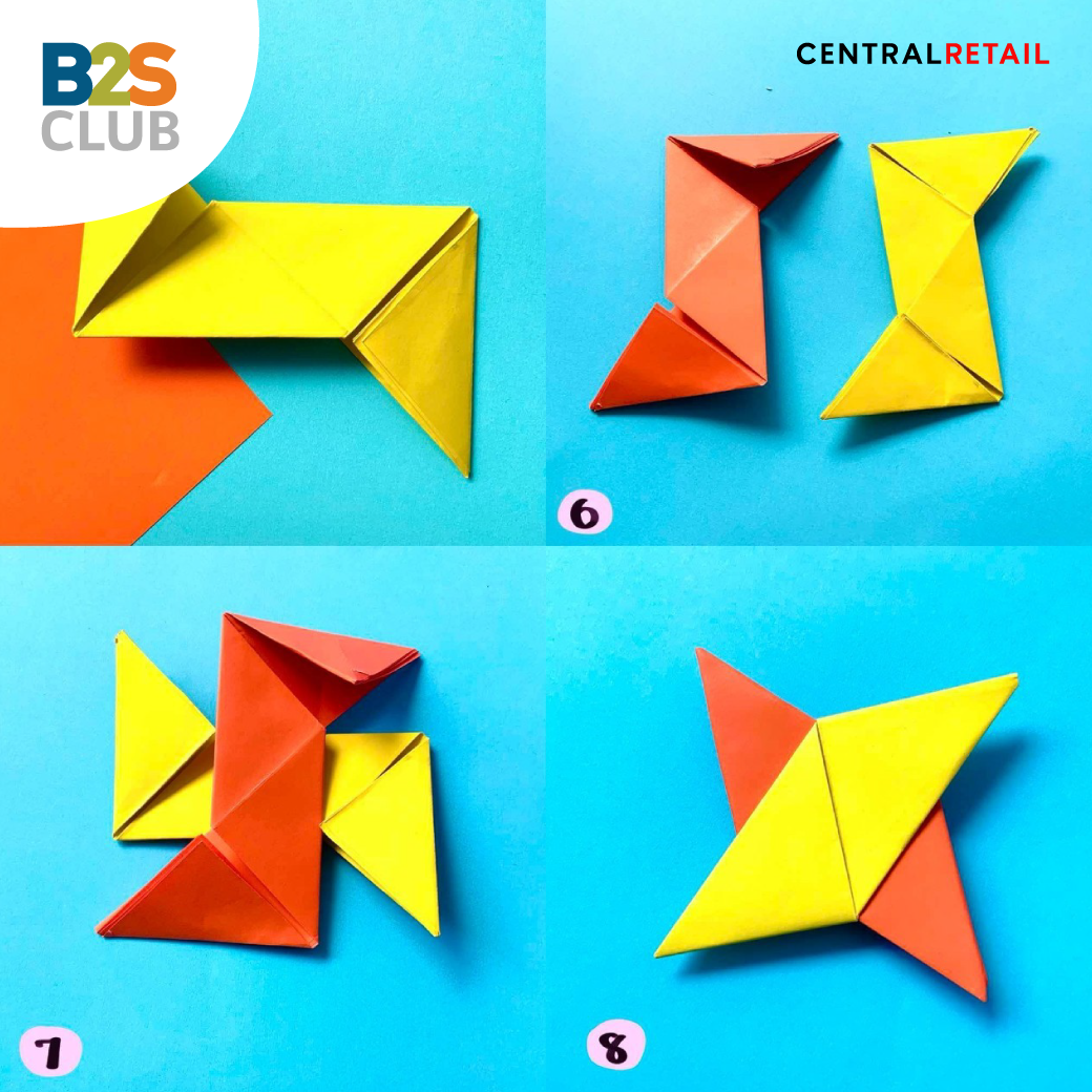 ขนาด  8x8 นิ้ว เพิ่มสีสันและความน่าใช้ตามใจชอบ ด้วยกระดาษสีสันฉูดฉาด ใช้ 2 แผ่น จับคู่สีให้สะดุดตา ตัวอย่างเช่น ส้ม-เหลือง   ฟ้า-น้ำเงิน  เขียว-ชมพู หลังจากนั้น พับกระดาษตามขั้นตอน เมื่อได้ชิ้นแรกแล้วให้พักรอไว้ แล้วพับแผ่นที่ 2 แบบเดียวกัน เสร็จแล้วนำกระดาษทั้ง 2 แผ่นมาประกบกัน