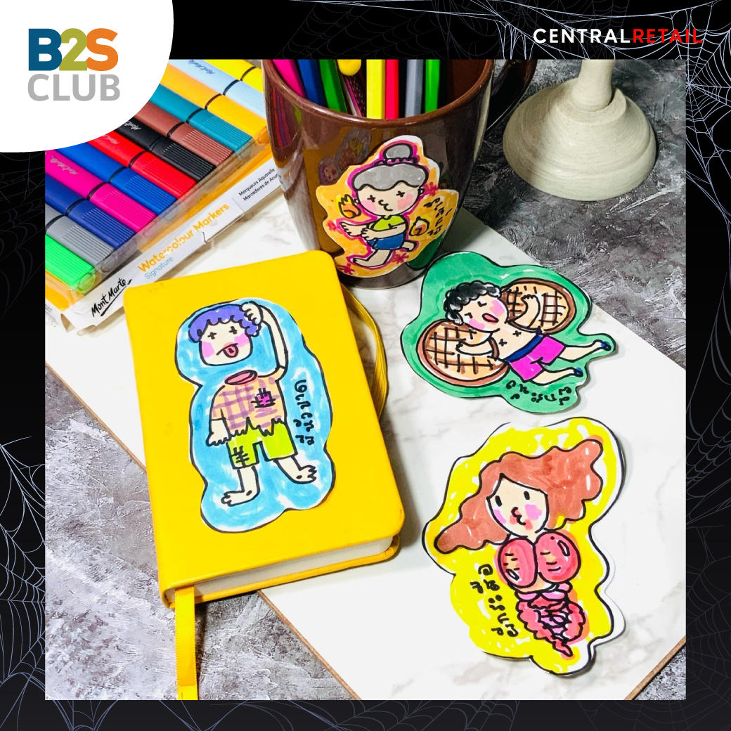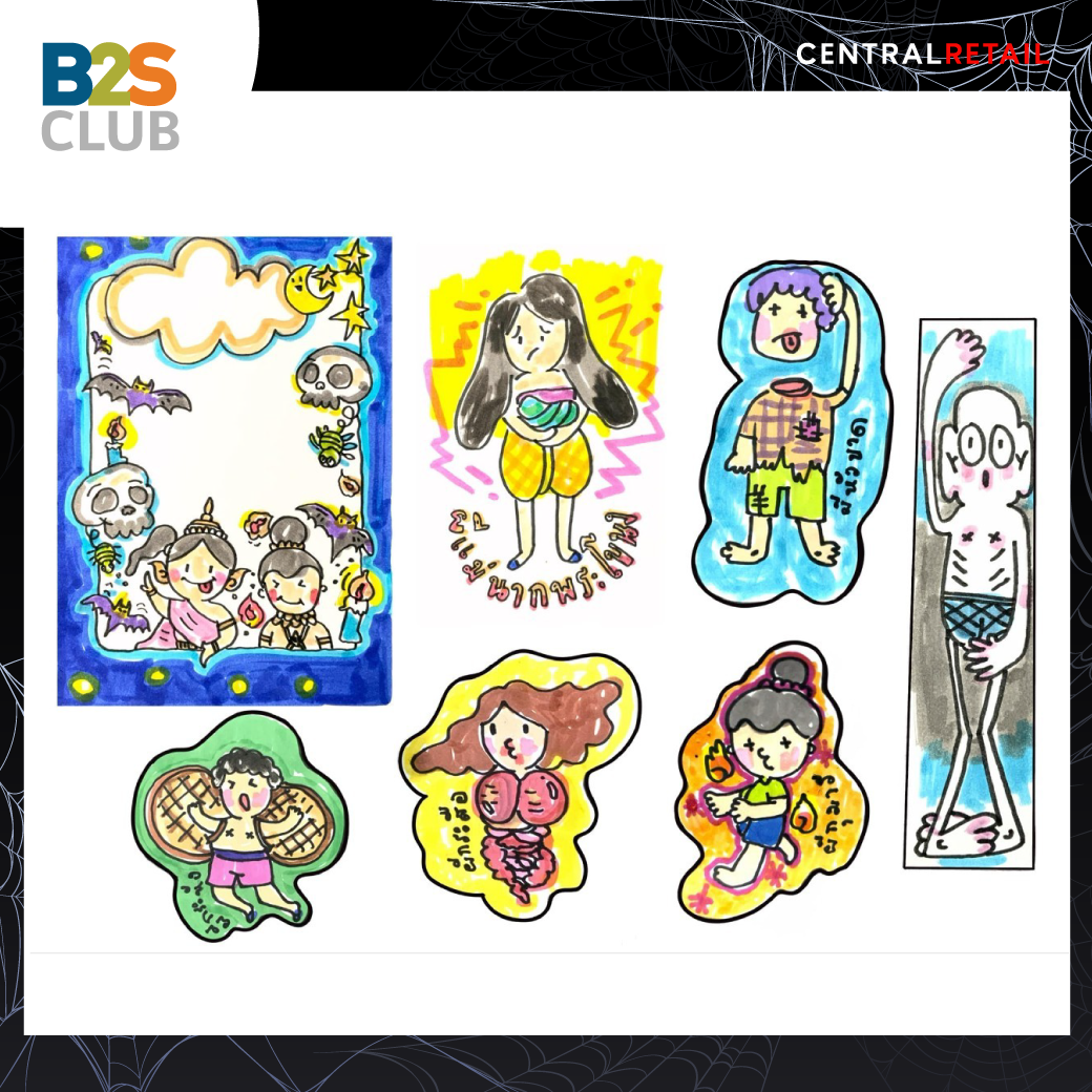วาดผีไทยคาแรกเตอร์ต่างๆ บนกระดาษสติ๊กเกอร์แบบด้าน วาดหลายๆตัว เช่น ผีหัวขาด ผีกระสือ ผีกระหัง ผีกุมาร ต่อด้วยระบายสีสันให้สวยงามตามใจชอบ เมื่อเสร็จแล้ว ใช้กรรไกรตัดขอบ ลอกกาวนำไปติดสมุดโน้ต ติดแก้วใส่ดินสอ หรือเคสมือถือ ทำให้เป็นของที่มีชิ้นเดียวในโลก ทั้งหลอนปนน่ารักสุดๆ