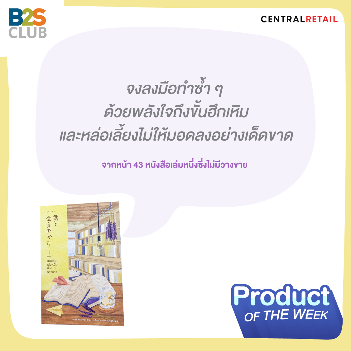 What: ชื่อหนังสือ “หนังสือเล่มหนึ่งซึ่งไม่มีวางขาย” หนังสือนิยายแปลจากภาษาญี่ปุ่นที่ขายไปแล้วกว่า 120,000 เล่มในญี่ปุ่น จากสำนักพิมพ์ Piccolo ราคา 225 บาท เขียนโดย ยาสึชิ คิตากาวะ แปลเป็นภาษาไทยโดย หนึ่งฤทัย ปราดเปรียว หน้าปกโปรยว่า “หนังสือสักเล่ม หรือใครสักคนที่ทำให้เราเลิกหลงทาง”