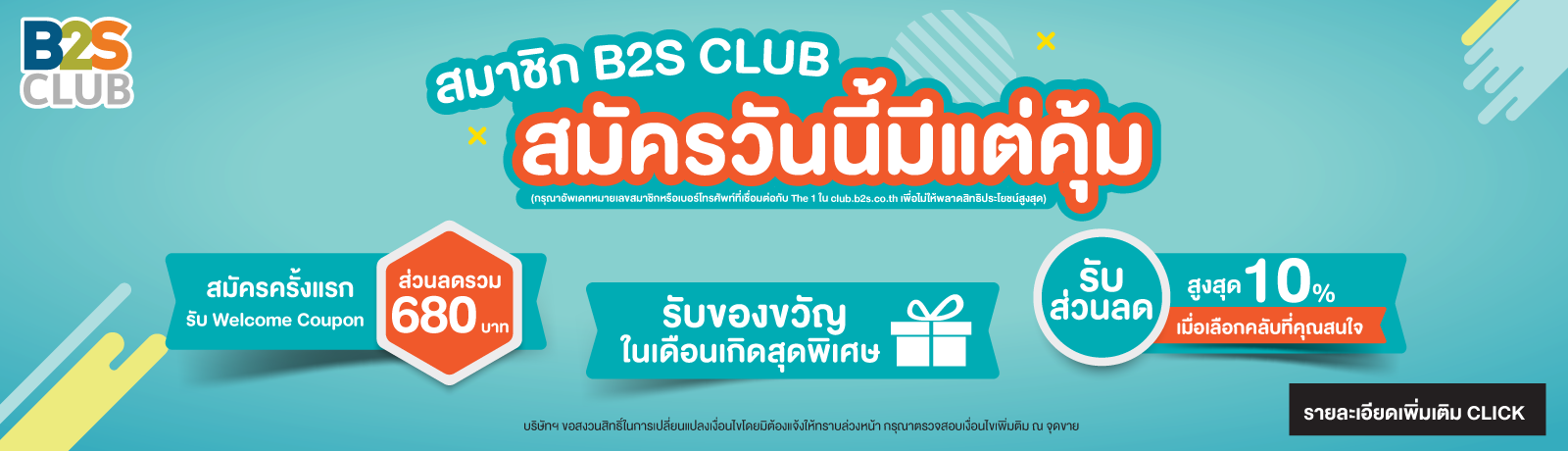 สมัครสมาชิก B2S CLUB รับส่วนลด และสิทธิประโยชน์ต่างๆ มากมาย คลิก https://club.b2s.co.th/th/register