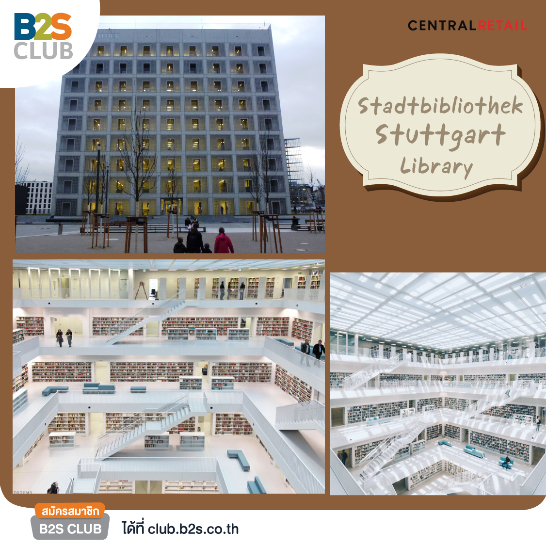 ออกจากโซนเอเชียพาคุณบินลัดฟ้าไปต่อกันที่ “ห้องสมุด Stadtbibliothek Stuttgart” ประเทศเยอรมัน ห้องสมุดทรงลูกบากศ์ที่ออกแบบไว้อย่างเรียบง่ายและสง่างามทั้งภายนอกอาคาร และภายในที่เน้นการตกแต่งด้วยสีขาวสะอาดตาโดยใช้อิฐแก้วเป็นวัสดุหลักในการออกแบบให้สอดรับกับแสงธรรมชาติช่วยประหยัดพลังงานภายใต้แนวคิดรักษ์โลก ที่ห้องสมุดแห่งนี้นอกจากจะมีหนังสือมากมายหลากหลายแนวแล้วยังมีกิจกรรมให้ทำมากถึง 4,000 กิจกรรมต่อปีที่หมุนเวียนเชิญชวนให้ผู้คนได้มีส่วนร่วมกับห้องสมุดตอบโจทย์ชีวิตของคนยุคใหม่อย่างแท้จริง การเดนทางโดยรถไฟลงที่สถานีรถไฟกลางสตุ๊ดการ์ทและเดินต่ออีก 900 ร้อยเมตรก็ถึงแล้วค่ะ