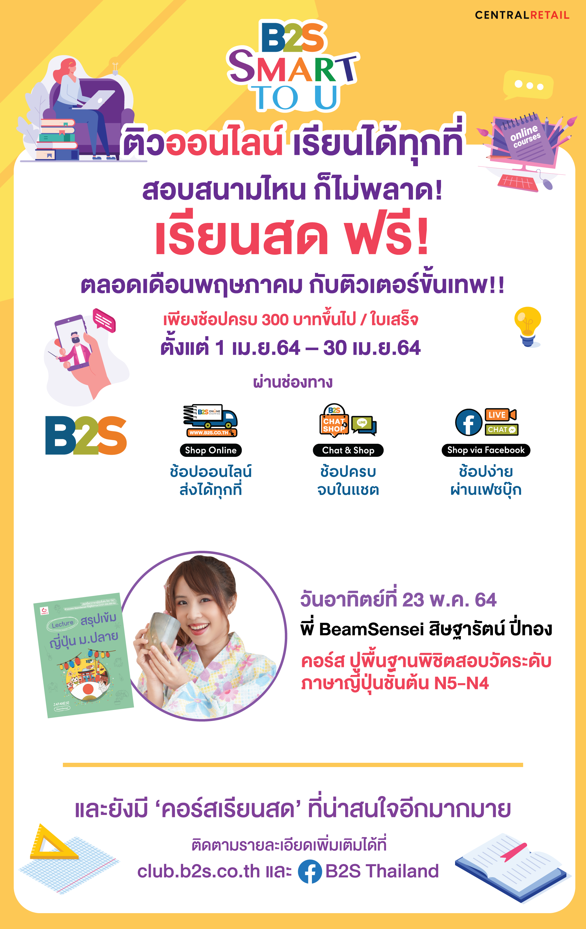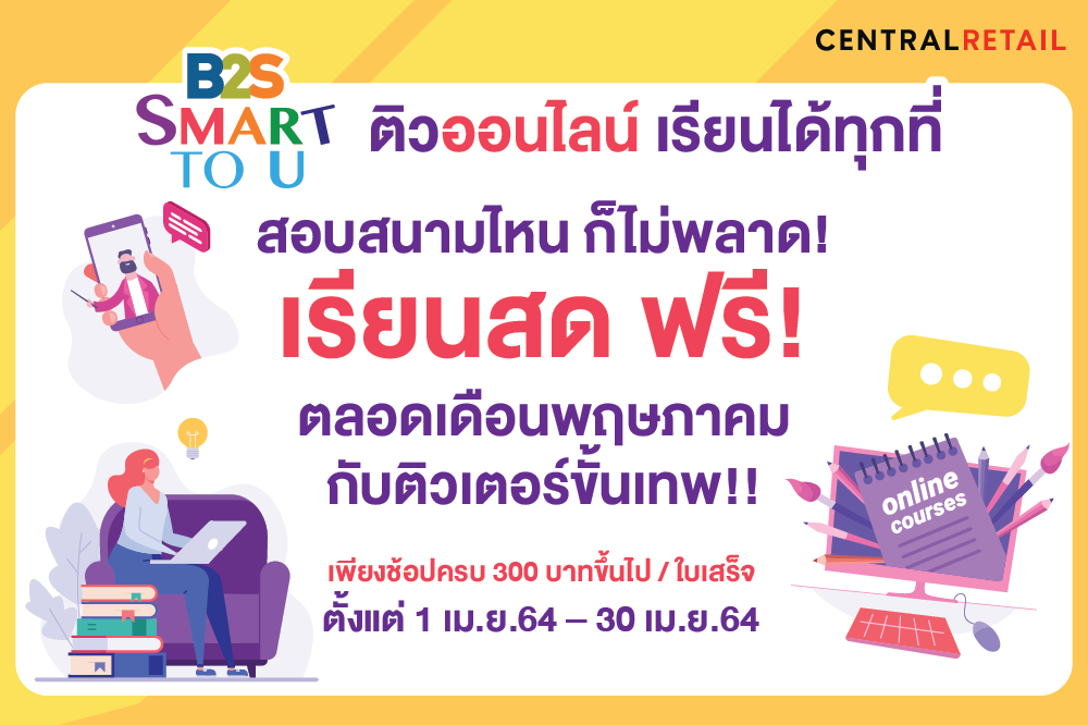 B2S SMART TO U ชวนติวออนไลน์ ซื้อสินค้าครบ 300 บาท รับสิทธิ์ติวฟรี เดือนพ.ค.ตลอดทั้งเดือน