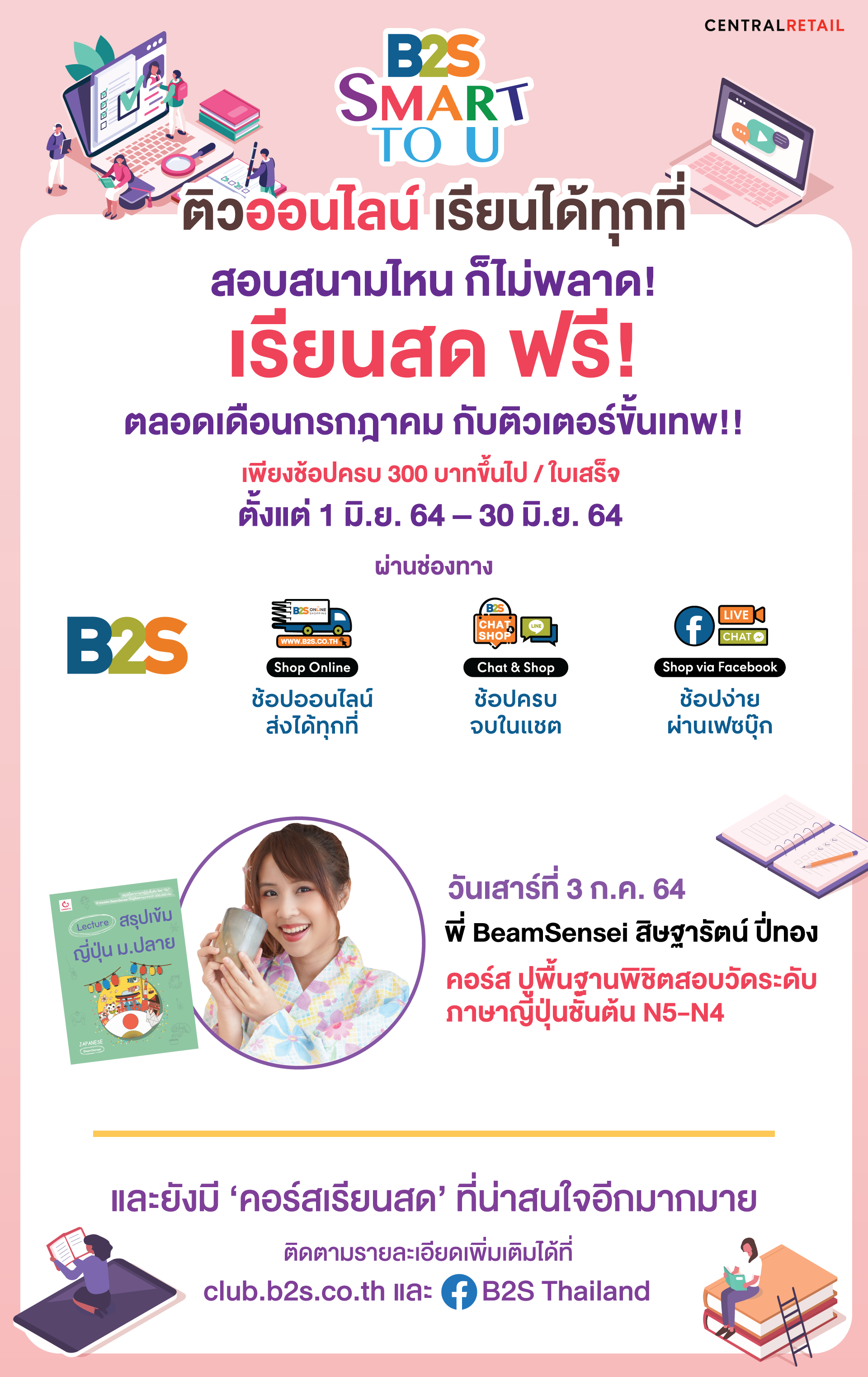 B2S SMART TO U ชวนติวออนไลน์ ซื้อสินค้าครบ 300 บาท รับสิทธิ์ติวฟรี เดือน ก.ค. ตลอดทั้งเดือน