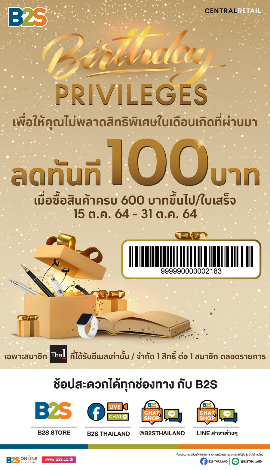 2. รับส่วนลด 100 บาท เมื่อซื้อสินค้าที่ B2S ครบ 600 บาทขึ้นไป/ใบเสร็จ