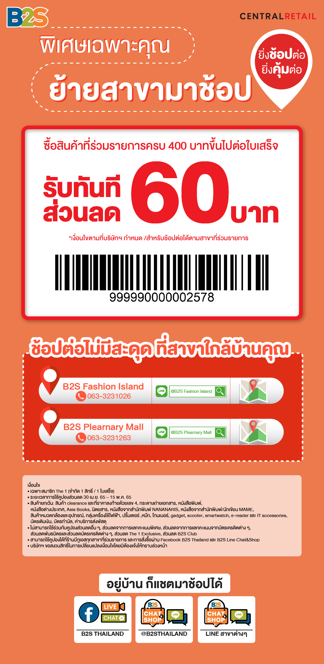 B2S เซ็นทรัลรามอินทรา ให้บริการวันสุดท้าย 30 เม.ย. 65 เฉพาะคุณ! รับคูปองลดเพิ่ม 60 บาท ให้ช้อปได้ต่อ ถึง 15 พ.ค. 65