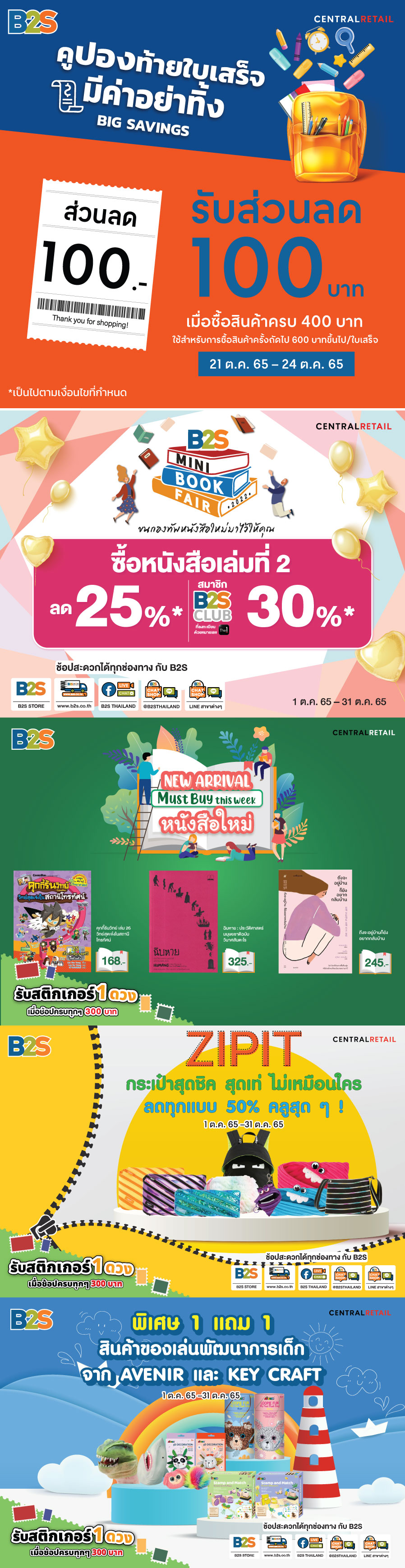 เมื่อซื้อสินค้าที่ร้าน B2S ครบ 400 บาทขึ้นไป/ใบเสร็จ รับคูปองท้ายใบเสร็จมูลค่า 100 บาท สำหรับซื้อสินค้าที่ร่วมรายการครั้งถัดไป 600 บาทขึ้นไป/ใบเสร็จ (เฉพาะสมาชิก The1)