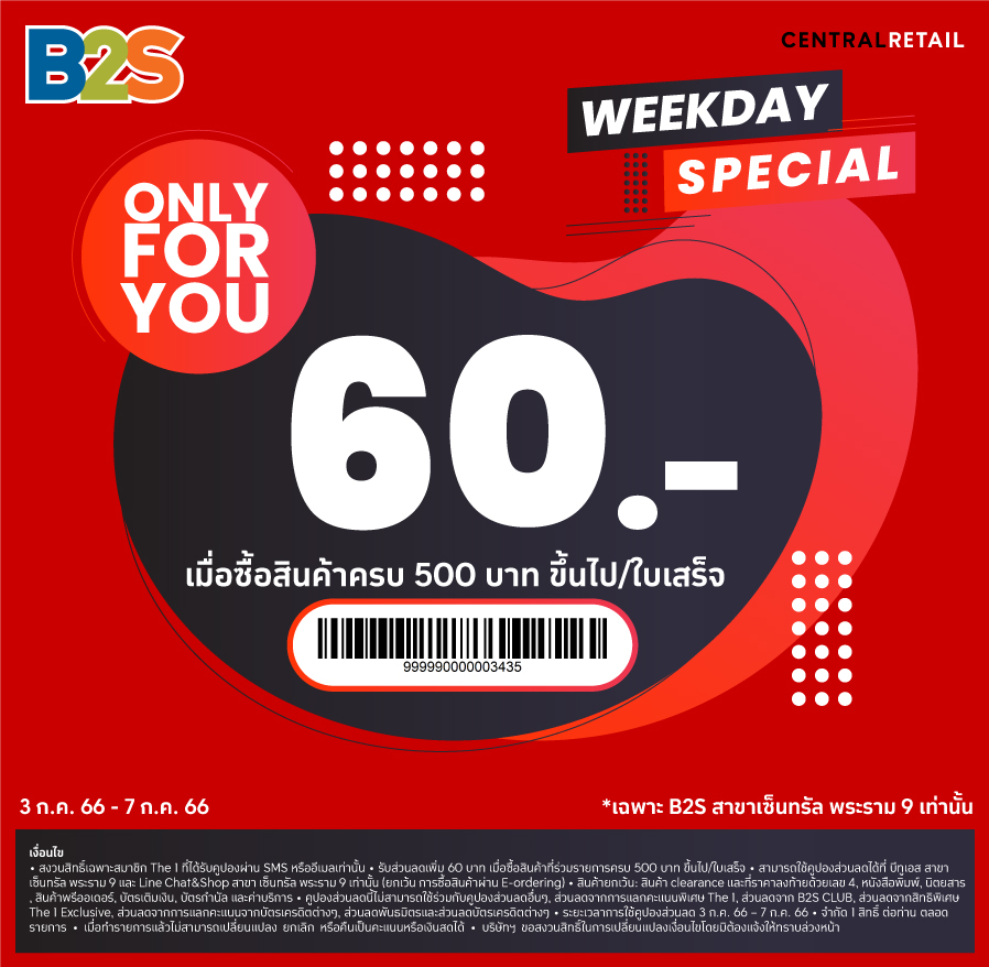 Weekday Special! รับส่วนลดพิเศษเฉพาะคุณ 60 บาท* เฉพาะ B2S สาขา เซ็นทรัล พระราม 9 เท่านั้น