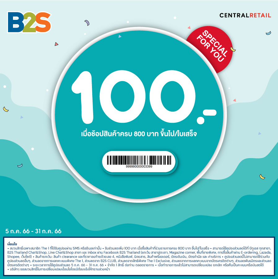 • คูปองส่วนลดนี้ไม่สามารถใช้ร่วมกับคูปองส่วนลดอื่นๆ, ส่วนลดจากการแลกคะแนนพิเศษ The 1,  ส่วนลดจาก B2S CLUB,  ส่วนลดจากสิทธิพิเศษ The 1 Exclusive,  ส่วนลดจากการแลกคะแนนจากบัตรเครดิตต่างๆ,  ส่วนลดพันธมิตรและส่วนลดบัตรเครดิตต่างๆ