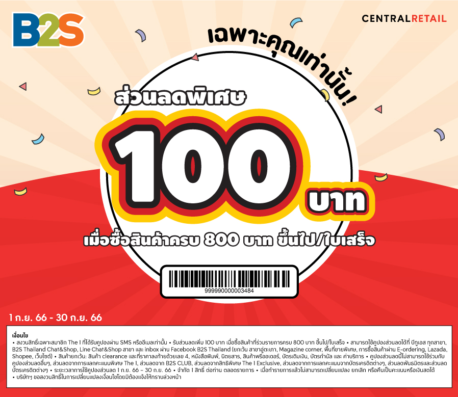 คูปองส่วนลดพิเศษ! ลดเพิ่ม 100 บาท* ไว้ช้อปสินค้าใหม่สุดฮิตราคาพิเศษ ที่ B2S ทุกสาขา ถึง 30 ก.ย. 66