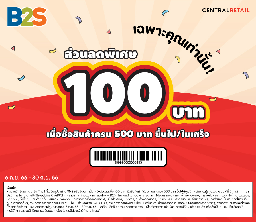 • คูปองส่วนลดนี้ไม่สามารถใช้ร่วมกับคูปองส่วนลดอื่นๆ, ส่วนลดจากการแลกคะแนนพิเศษ The 1, ส่วนลดจาก B2S CLUB, ส่วนลดจากสิทธิพิเศษ The 1 Exclusive, ส่วนลดจากการแลกคะแนนจากบัตรเครดิตต่างๆ, ส่วนลดพันธมิตรและส่วนลดบัตรเครดิตต่างๆ