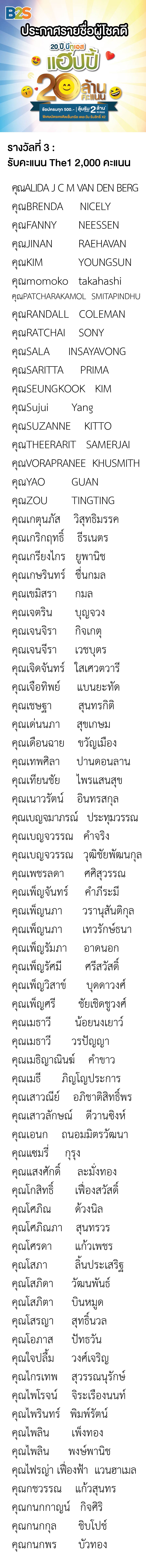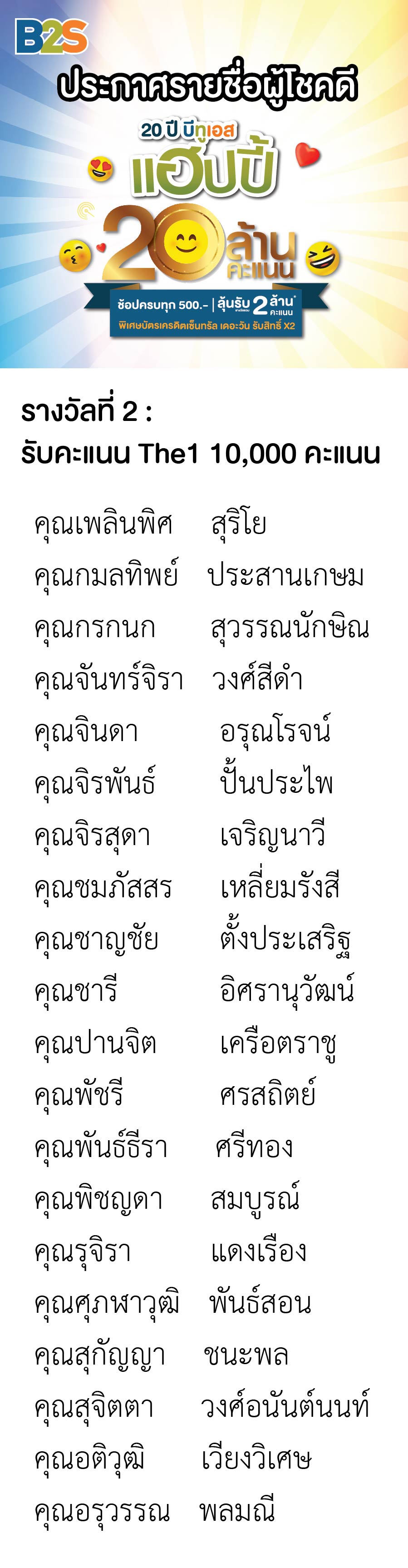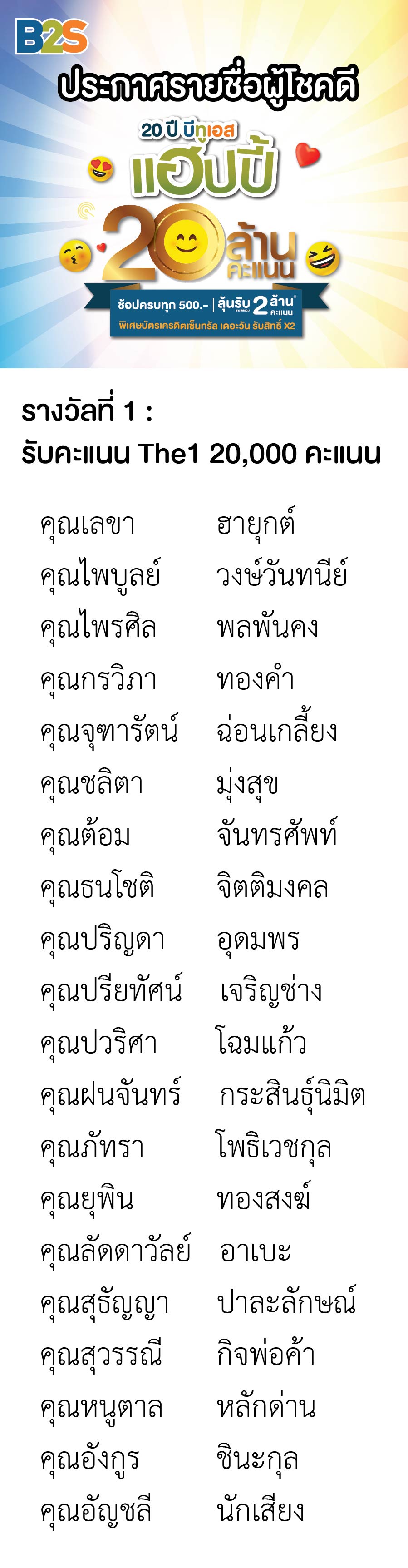 ประกาศรายชื่อผู้โชคดีจากโปรโมชั่น B2S ฉลองครบรอบ 20 ปี ลุ้นรับคะแนน The1 รวม 2 ล้านคะแนน
