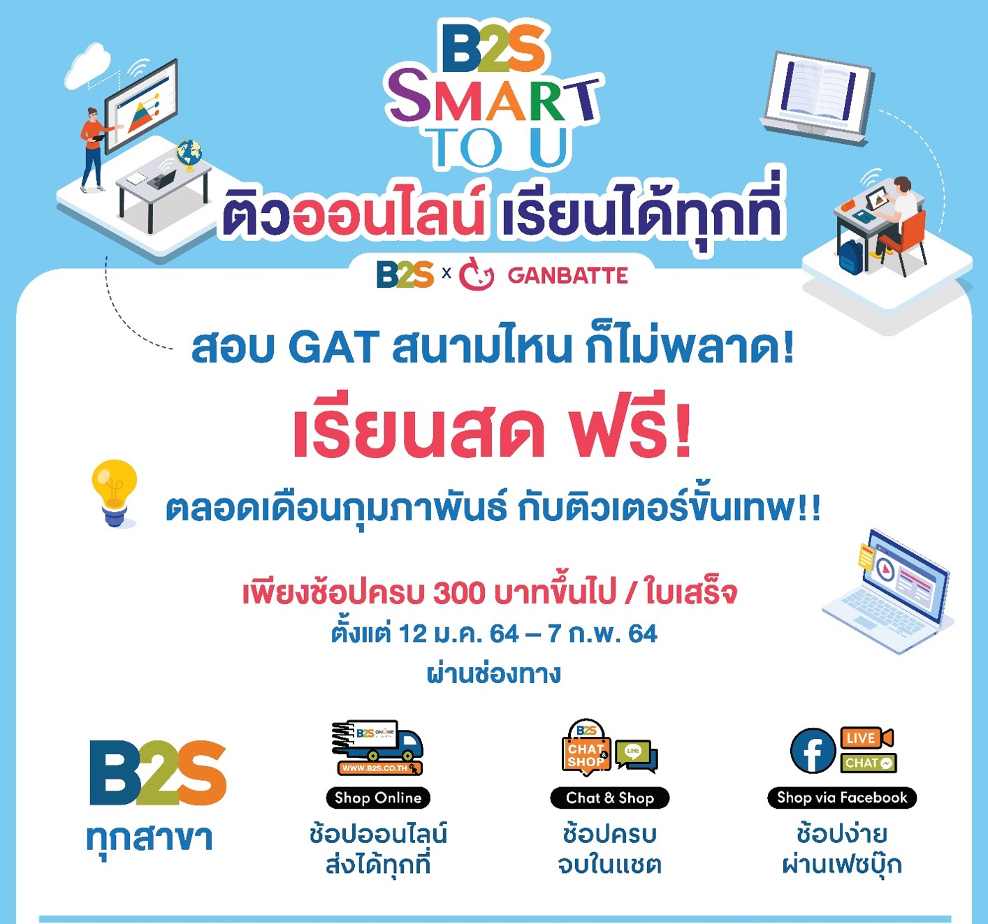 B2S SMART TO U ชวนติวออนไลน์ที่บ้าน ซื้อสินค้าที่ B2S ครบ 300 บาท ลงทะเบียนรับสิทธิ์ติวฟรี เดือนก.พ. ตลอดทั้งเดือน