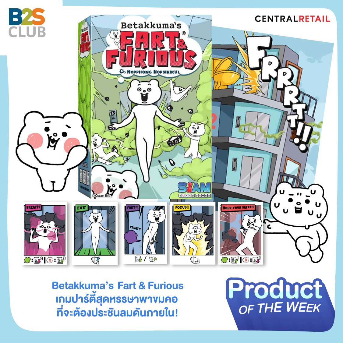 Betakkuma’s Fart & Furious เกมปาร์ตี้สุดหรรษาพาขมคอ สำหรับผู้เล่น 3-8 คนที่คุณและเพื่อน ๆ จะต้องประชันลมดันภายใน!ประเภทเกม : ปาร์ตี้ อายุผู้เล่น 6+