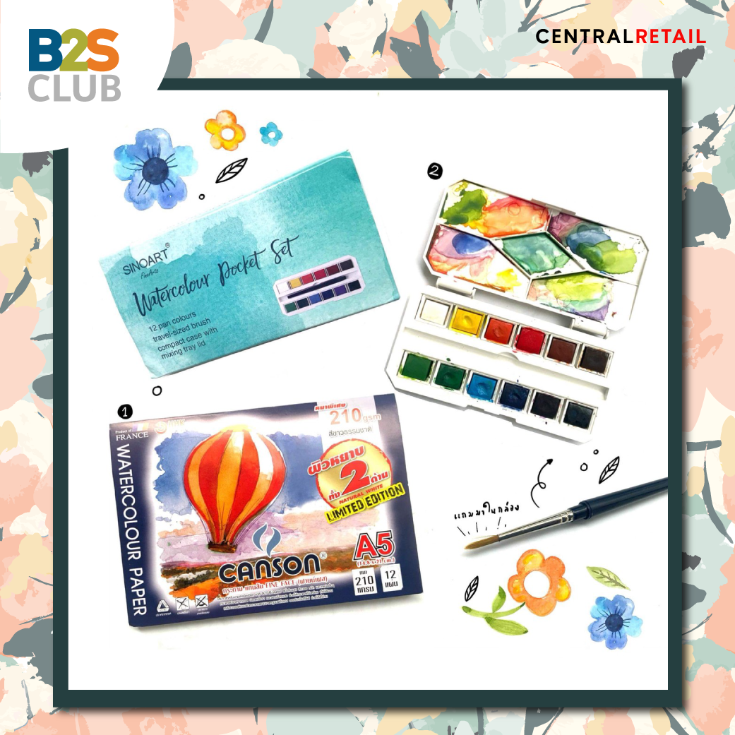 ชุดสีน้ำก้อนนี้มาพร้อมพู่กันในกล่องพลาสติก ขนาดกะทัดรัด พกพาสะดวก น้ำหนักเบา อยากผสมสีที่ไหนก็สะดวก เพราะตรงฝาด้านในมีช่องแบ่งไว้ให้ผสมสีได้ทันที ส่วนสมุดวาดรูปก็ควรใช้ที่หนาสักหน่อย ประมาณ 210 แกรมก็เพียงพอ เพราะน้ำอาจทำให้กระดาษทะลุได้หากใช้กระดาษประเภทอื่น ไม่ได้มาตรฐาน เลือกขนาดใดก็ได้ แนะนำ A5 เป็นขนาดเหมาะมือ เมื่อพร้อมแล้ว เตรียมน้ำสะอาด แล้วลุยกันเลย!