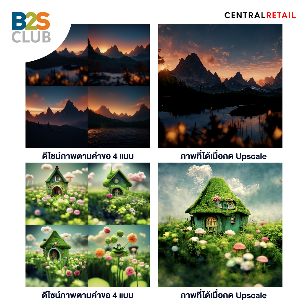 4. Midjourney bot จะสร้างภาพจากคีย์เวิร์ดของเรามาให้เลือก 4 ภาพ ภายในเวลา 60 วินาที ใต้ภาพปรากฏปุ่ม U1, U2, U3, U4 สำหรับคำสั่ง Upscale ตามลำดับ เพื่อพัฒนาเฉพาะรูปที่เราเลือก และมีปุ่ม V1, V2, V3, V4 สำหรับคำสั่ง Variation เพื่อที่จะให้สร้างสรรค์ผลงานใหม่ที่ใกล้เคียง