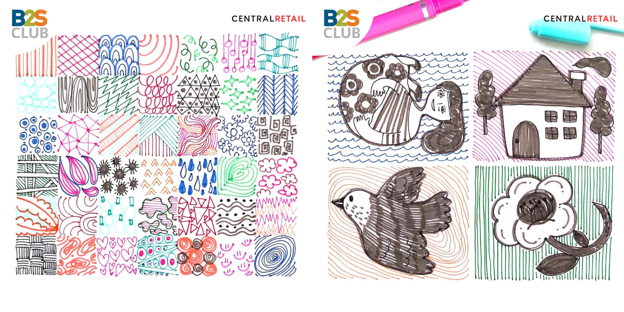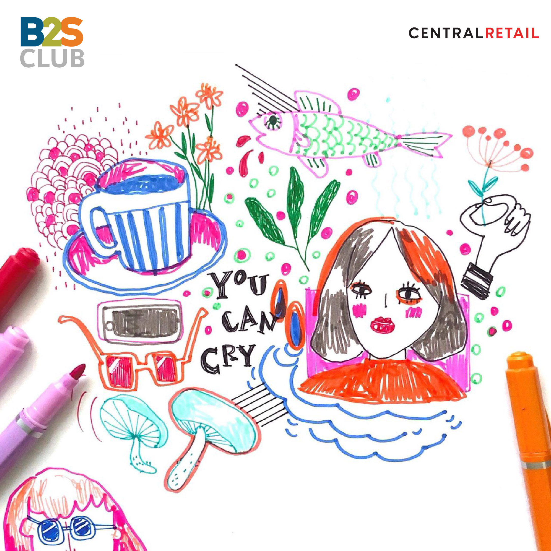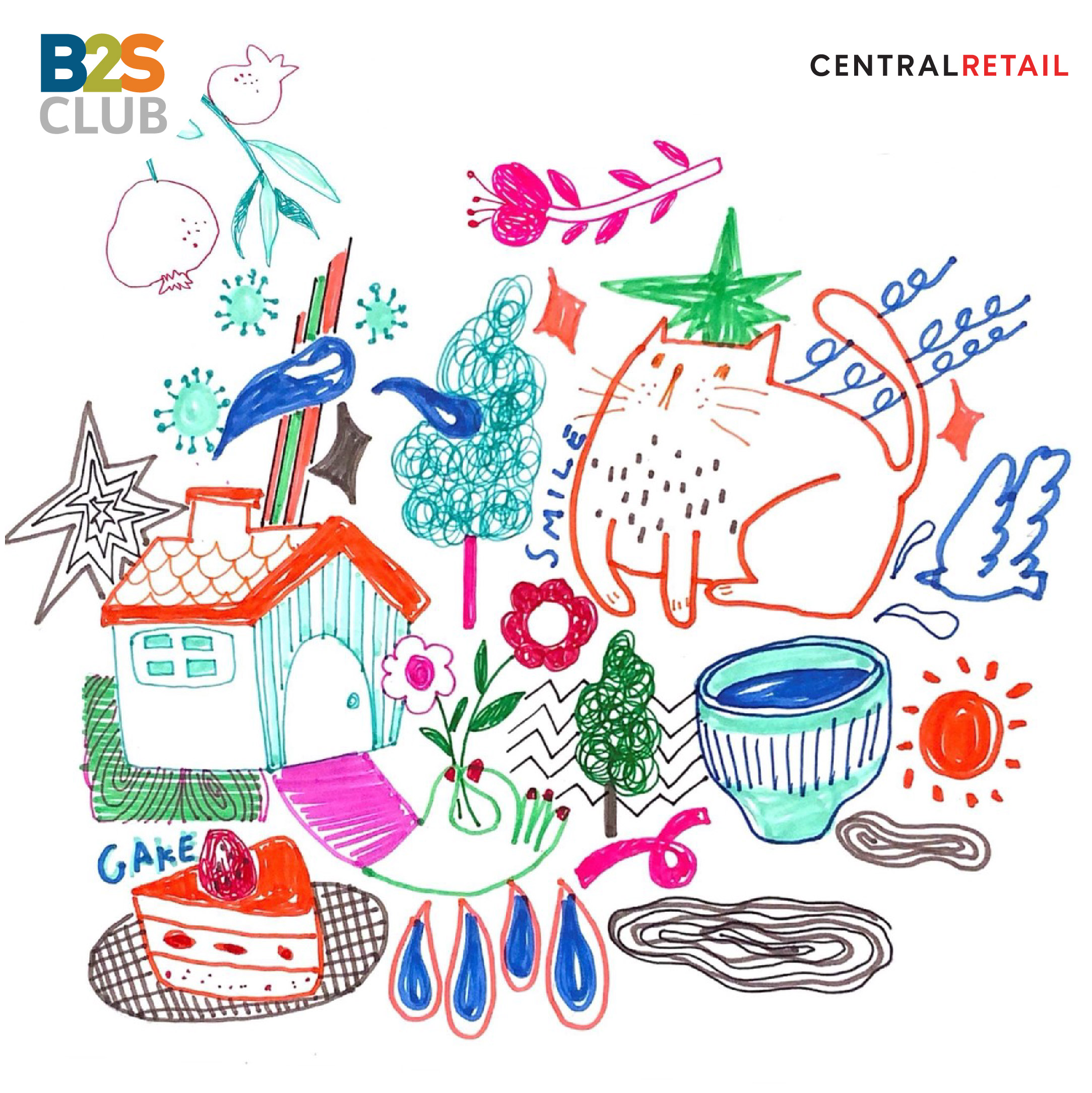 เห็นมั้ย~ ผลงานชิ้นนี้ ทางเราก็ไม่ได้คิดอะไร แค่ปล่อยให้มือได้ขยับ ลากเส้นต่อไปเรื่อยๆ นึกถึงสิ่งที่ชอบและอยากให้ออกมาเป็นรูป แค่นี้ก็พอแล้ว และบอกเลยว่า ปากกาสี B2S เขาทำได้ดีจริงๆ สีชัด วาดง่าย จะหยิบใช้สีไหนก็สวยไปหมด รูปที่วาดดูมีีเอกลักษณ์ขึ้นมาเลย