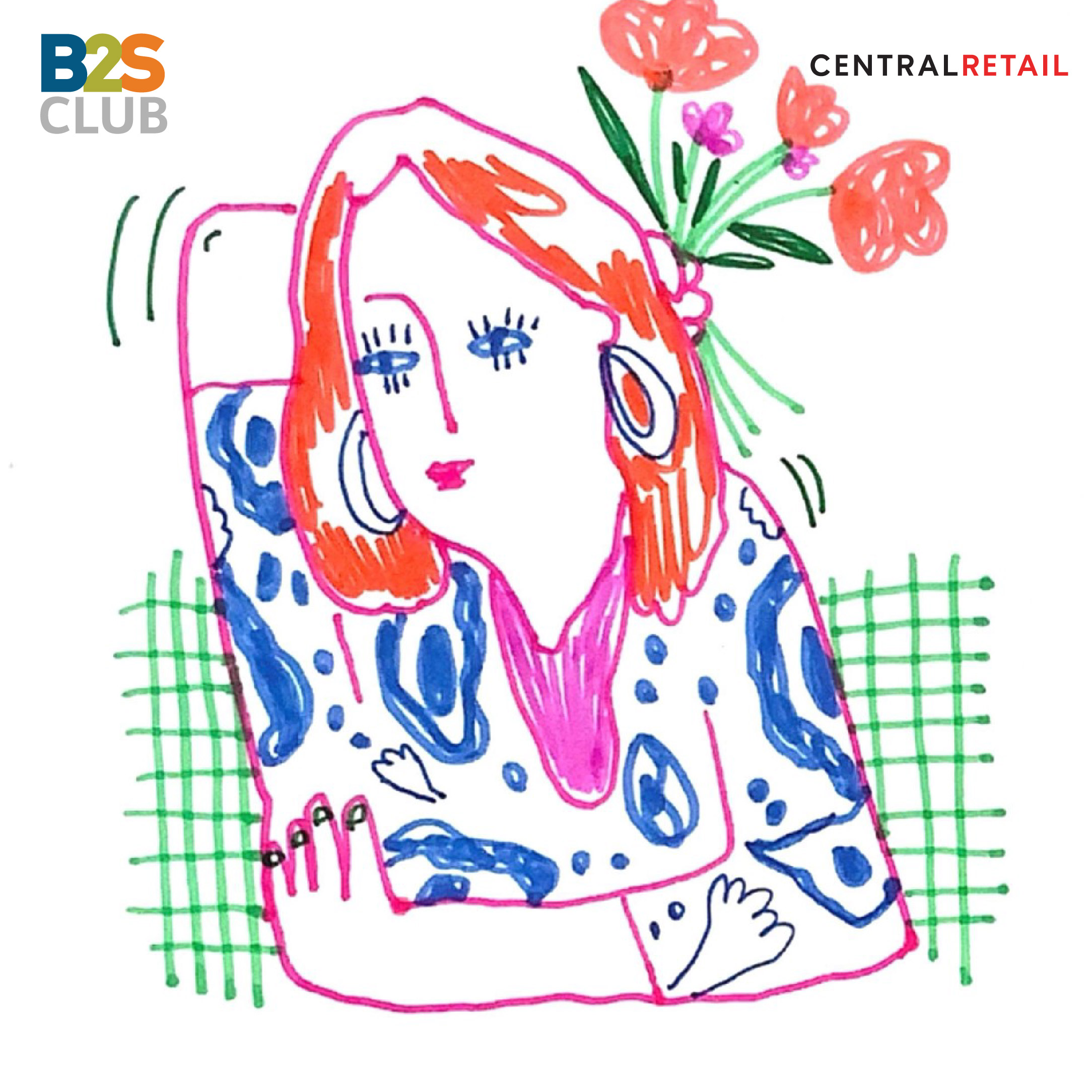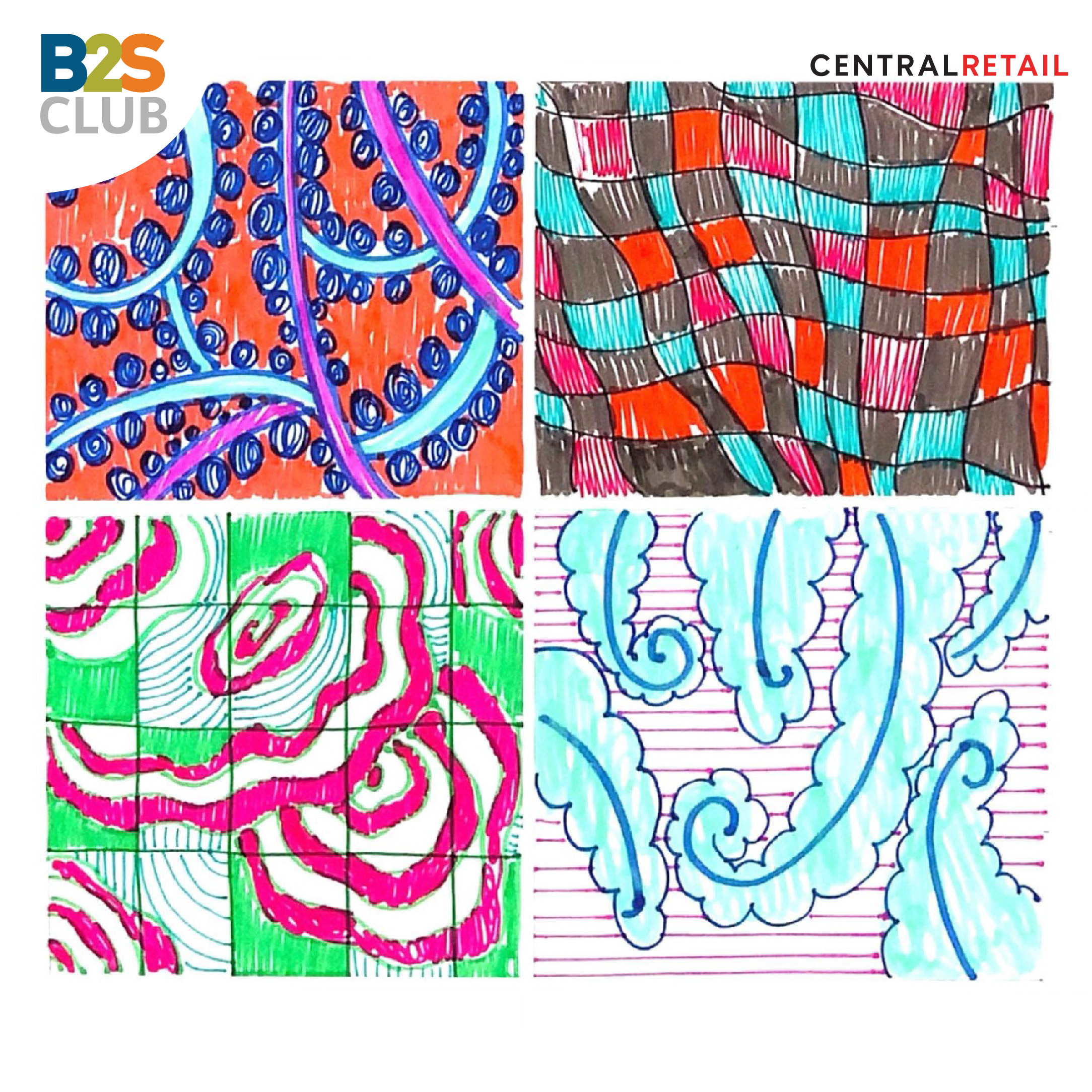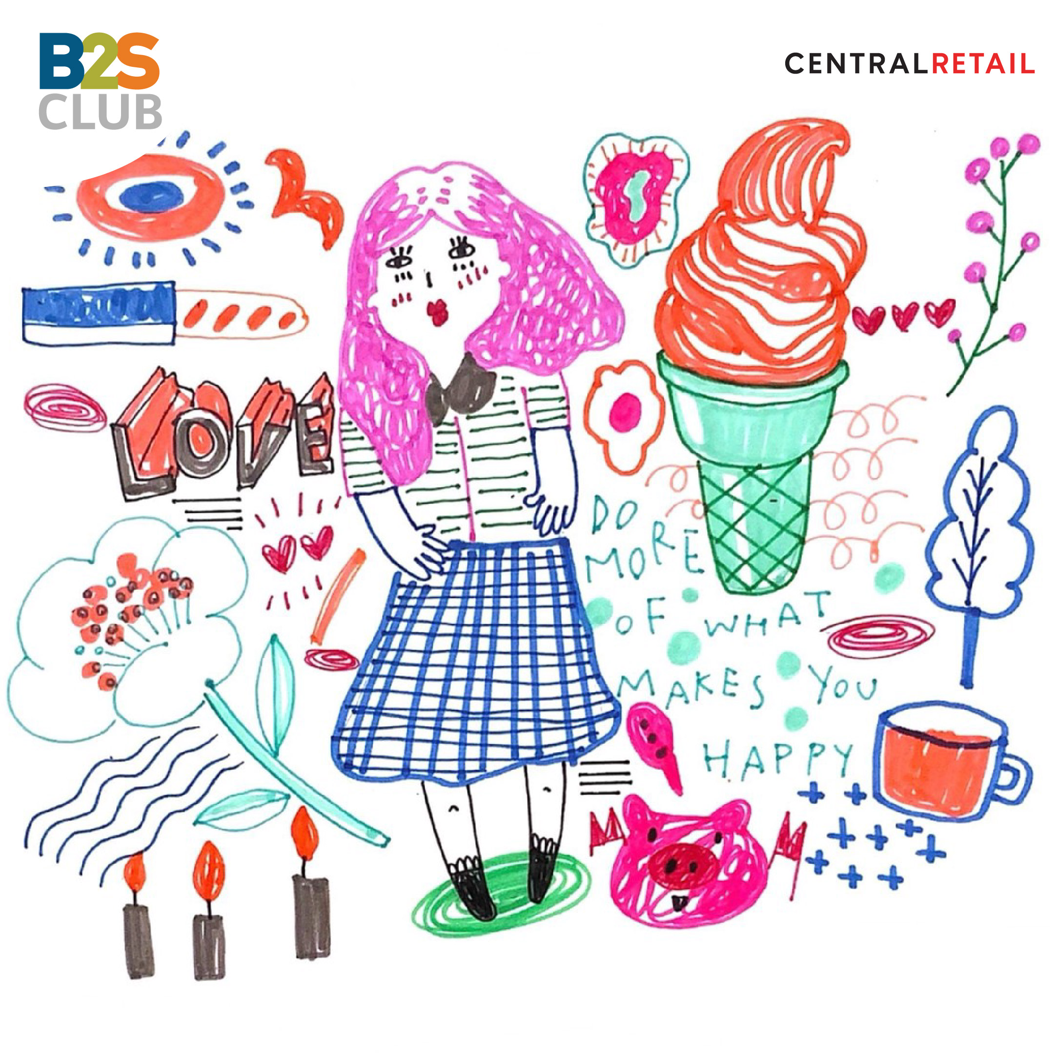เห็นมั้ย~ ผลงานชิ้นนี้ ทางเราก็ไม่ได้คิดอะไร แค่ปล่อยให้มือได้ขยับ ลากเส้นต่อไปเรื่อยๆ นึกถึงสิ่งที่ชอบและอยากให้ออกมาเป็นรูป แค่นี้ก็พอแล้ว และบอกเลยว่า ปากกาสี B2S เขาทำได้ดีจริงๆ สีชัด วาดง่าย จะหยิบใช้สีไหนก็สวยไปหมด รูปที่วาดดูมีีเอกลักษณ์ขึ้นมาเลย