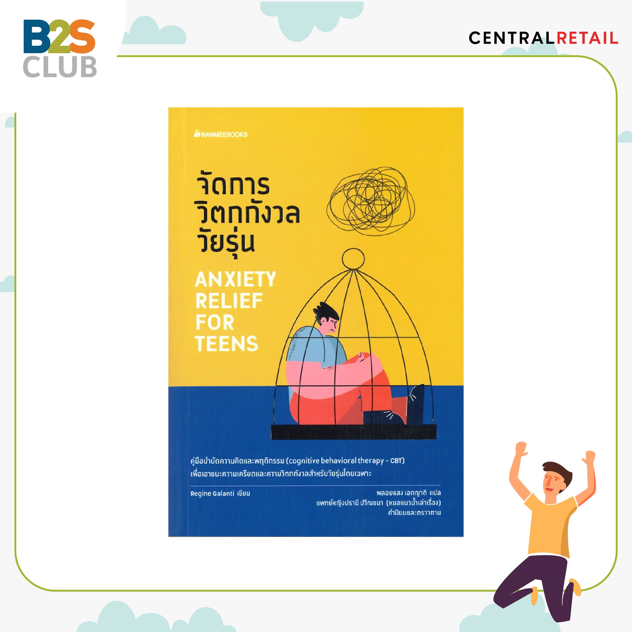 หนังสือแบบฝึกหัดง่าย ๆ ที่ทำตามได้จริง ช่วยปรับเปลี่ยนความคิดและพฤติกรรมจากปัญหาความวิตกกังวลต่างๆ ที่จะทำลายชีวิตวัยรุ่น เขียนโดย ดร.เรจีน กาลันตี นำวิธีบำบัดความคิดและพฤติกรรม (CBT) กับการการฝึกสติ (mindfulness) มาบอกเล่า ไม่ว่าจะเป็นการ“กลัวว่าจะไม่เก่งเท่าเพื่อน” “กังวลเมื่ออยู่กับคนที่ไม่สนิท” “ไม่สบายใจเมื่อต้องทำอะไรตามลำพัง” หรือ “กังวลมักหายใจไม่ออก วิงเวียน ตัวสั่น “ เป็นต้น เหมาะสำหรับหลายคนที่ต้องเผชิญกับความเครียด ทำให้สามารถรับมือกับความวิตกกังวล รวมถึงเข้าใจโรคย้ำคิดย้ำทำ โรคตื่นตระหนก โรคซึมเศร้า โรคกลัวได้ดีขึ้นด้วย