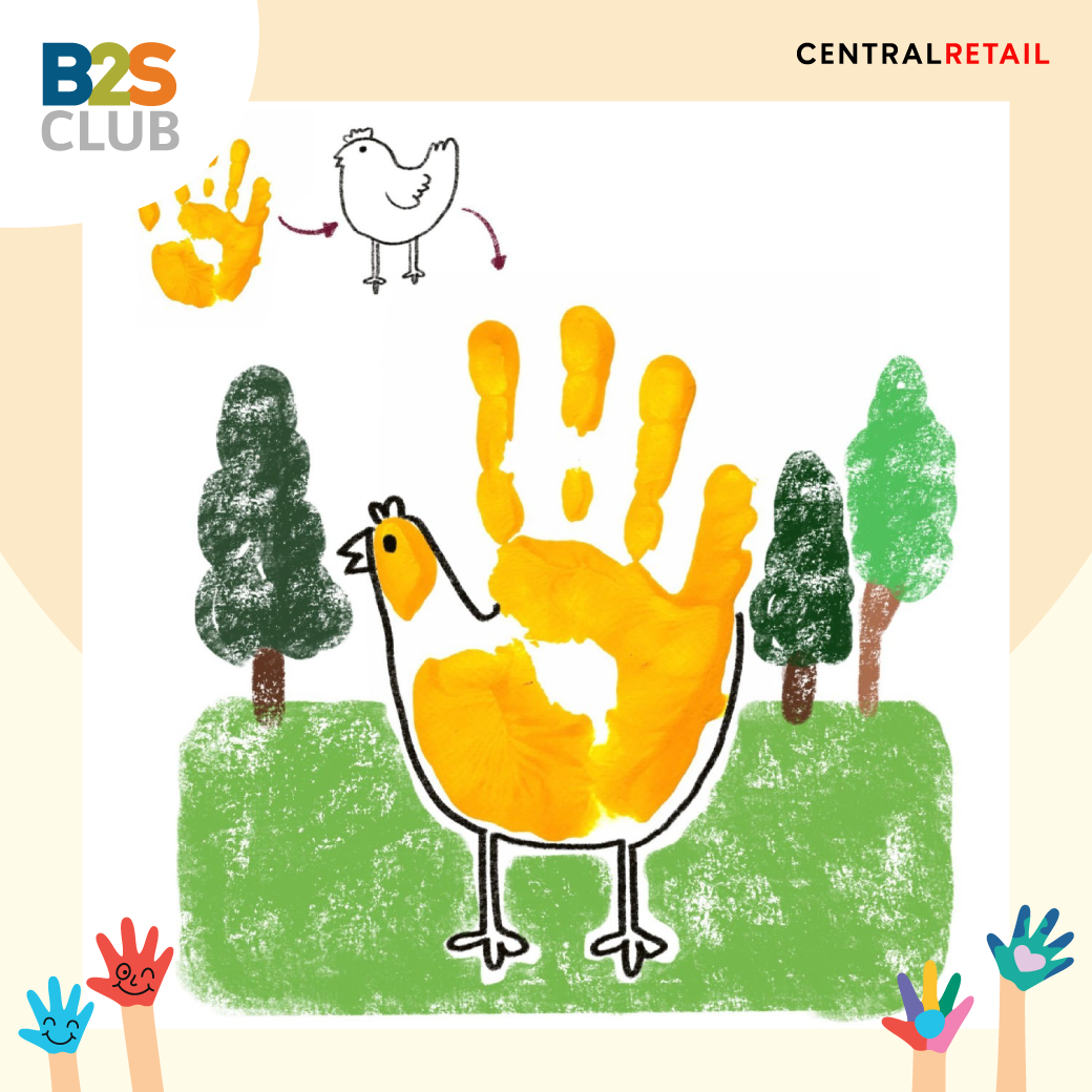 3.เมื่อพิมพ์มือและเท้าได้ตามจำนวนที่ต้องการแล้ว นำไปตากอย่างน้อยครึ่งชั่วโมง เพื่อให้สีแห้งสนิท ก่อนจะนำมาวาดรูปสัตว์ต่างๆ ตามการสังเกตเห็น ใส่จินตนาการตามสไตล์ของแต่ละคนได้เต็มที่เลย