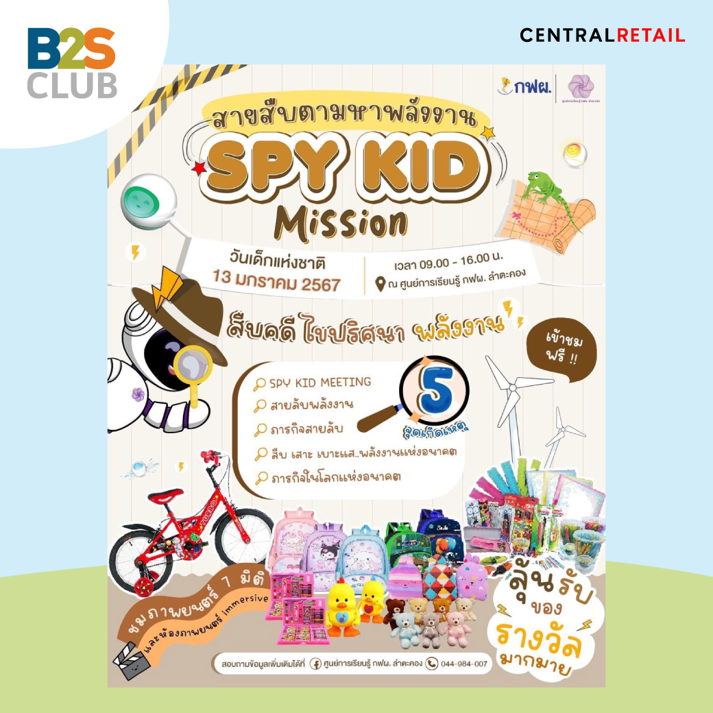 ชวนเด็กมาสวมบทบาทเป็นนักสืบน้อย ในงานวันเด็กแห่งชาติกับกฟผ. ร่วมผจญภัยไขปริศนาในดินแดนพลังงาน กับกิจกรรม "สายสืบตามหาพลังงาน Spy Kid Missions” สนุกกับกิจกรรมสืบคดี ไขปริศนามากมาย ไม่ว่าจะเป็น SPY KID MEETING, สายลับพลังงาน, ภารกิจสายลับ, สืบเสาะ เบาะแส พลังงานแห่งอนาคต และภารกิจในโลกแห่งอนาคต พร้อมชมภาพยนตร์ 7 มิติ ในโรงภาพยนตร์ immersive จัดเต็มแสง สี เสียง ตื่นตาตื่นใจ ที่มีเอฟเฟ็กต์ลม สัมผัสขา และเก้าอี้โยกสนุกสุดเหวี่ยง เด็กๆ ห้ามพลาด พบกันที่ศูนย์การเรียนรู้กฟผ. ลำตะคอง จ.นครราชสีมา ตั้งแต่ตั้งแต่เวลา 09.00 น. - 16.00 น.