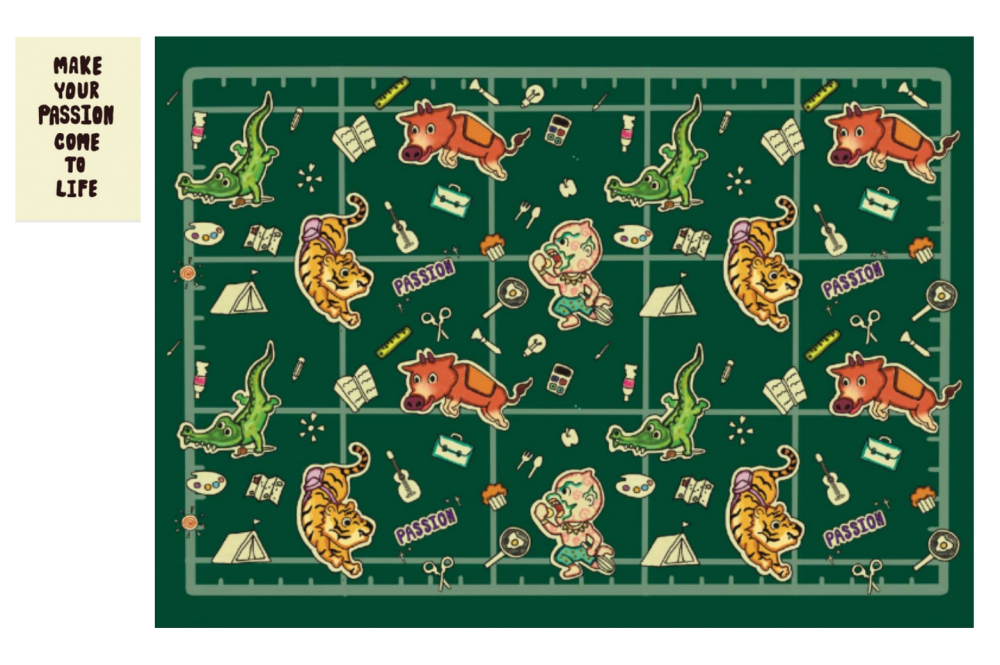 ทั้ง 4 คาแรคตอร์และแพสชั่นต่างๆเป็นเหมือนสติ๊กเกอร์และกระดาษตัดแปะที่อยู่บนแผ่นรองตัดสีเขียว สื่อถึงงานคราฟ"