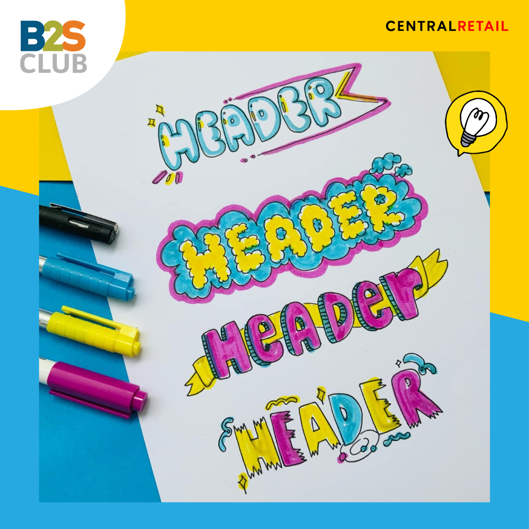 1. เน้นขอบของหัวข้อเน้นด้วยธง ลากไปตามข้อความ ช่วยเน้นให้ดูสวยแบบมีอะไร แต่ก็ไม่เยอะเกินไป เรียบๆ มินิมอล อ่านง่าย ให้หัวข้อดูน่ารักขึ้นด้วยการเขียนฟอนต์สไตล์ลูกโป่ง ลากแค่เส้นตัวอักษรให้อ้วนกลม เติมเพิ่มความเงาเหมือนลูกโป่งตัวทุก เพียงเท่านี้ก็เสร็จแล้ว