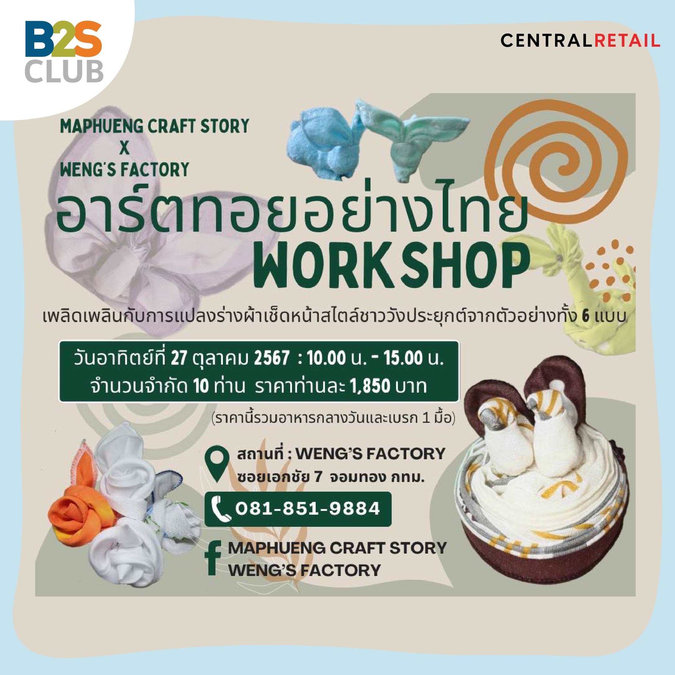 Workshop ที่เหมือนพาทุกคนหลุดไปอยู่ในวังจุฑาเทพ ตามตำรับของชาวรั้วชาววังสุดๆ กับกิจกรรมอาร์ตทอยอย่างไทย ที่ไม่ได้มีแค่เรื่องอาร์ตทอยแต่ยังชวนเพื่อนๆ มาเรียนรู้การพับผ้าเช็ดหน้าและผ้าขนหนูสไตล์ชาววังประยุกต์เป็นรูปร่างต่าง ๆ ถึง 6 แบบ สามารถนำไปใช้ในการต่อยอด สร้างผลิตภัณฑ์ Save Toy สำหรับเด็ก ๆ หรือนำไปสอนลูกสอนหลานเพื่อสร้างพัฒนาการตามช่วงวัย สอนโดย “ครูผึ้ง“ แห่ง Maphueng Craft Story