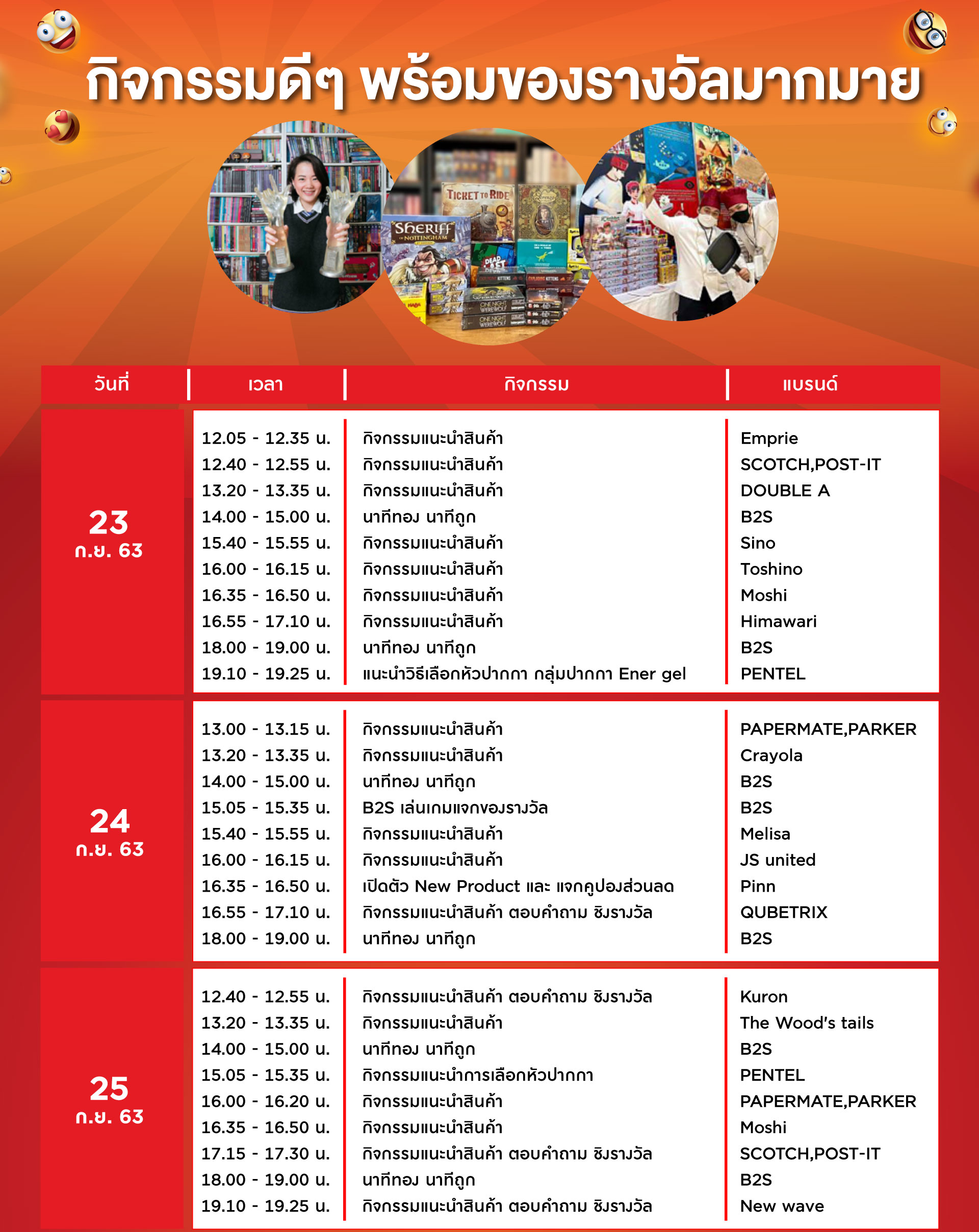 พลาดไม่ได้ ภายในงานทุกคนจะได้พบกับงานแฟร์สุดยิ่งใหญ่ ขนมาทั้งหนังสือน่าอ่าน ขบวนเครื่องเขียนน่าซื้อ สินค้าไลฟ์สไตล์ที่ห้ามพลาด มาพร้อมกับราคาถูกแบบช้อปกันจนช็อค