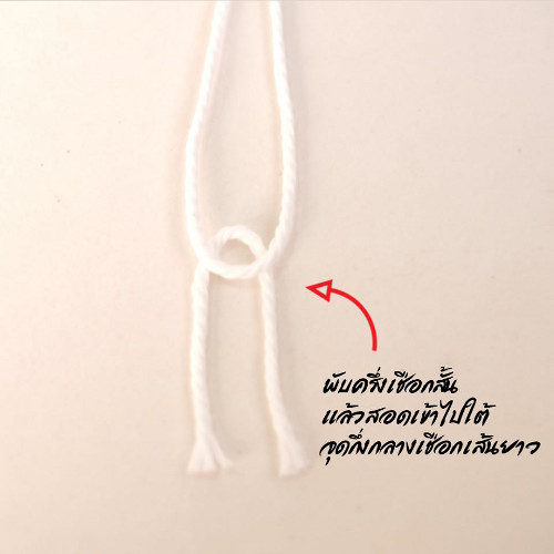 จากนั้นพับครึ่งเชือกเส้นสั้น แล้วสอดเข้าไปใต้จุดกึ่งกลางของเชือกเส้นยาว