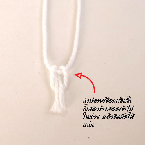 แล้วนำปลายเชือกเส้นสั้นทั้ง 2 ข้าง สอดเข้าไปในห่วง