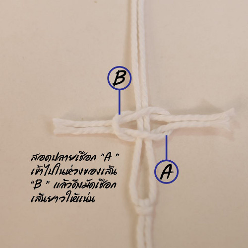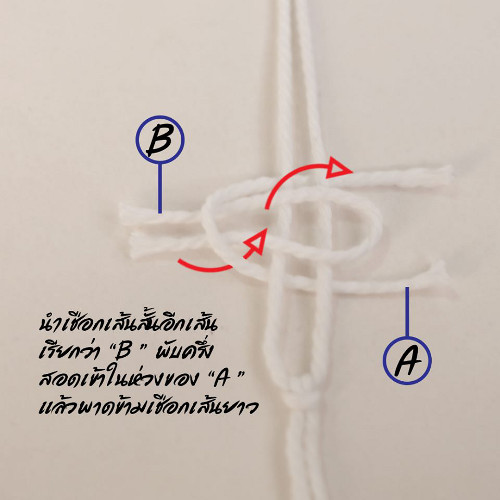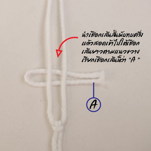 นำเชือกเส้นสั้นพับทบครึ่ง แล้วสอดเข้าไปใต้เชือกเส้นยาวตามแนวขวาง เรียกเชือกเส้นนี้ว่า A