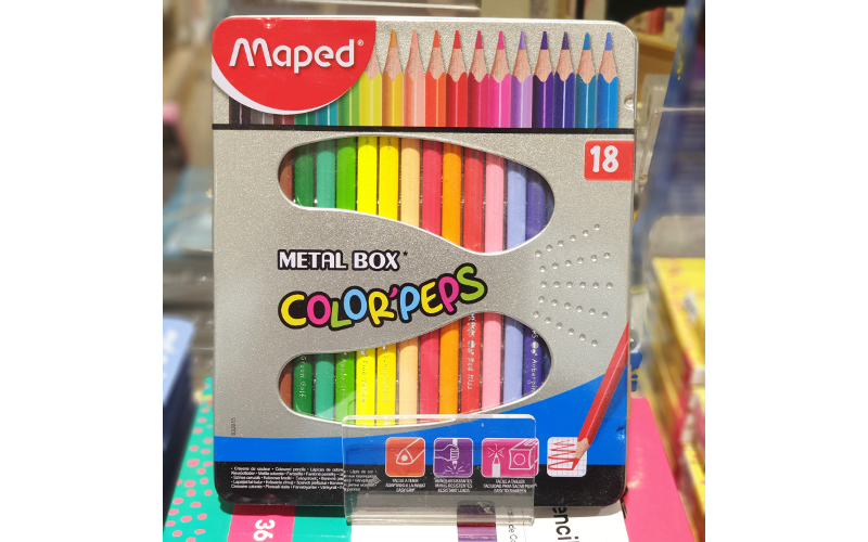“สีไม้ 18 เฉดสี” มาเป็นเซตในกล่องเหล็กจากแบรนด์  Maped ด้ามจับเป็นทรงสามเหลี่ยม ช่วยให้จับถนัดมือ เหลาง่าย สีเข้มสวย ระบายเนียนเรียบ มีหลายสีให้เด็กๆเริ่มฝึก ระบายสี ได้ตรงกับจินตนาการและสนุกกับศิลปะมากขึ้น