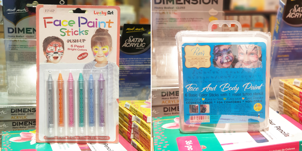 เพิ่มความสนุกอีกขั้นด้วยการใช้สีเพ้นต์หน้า ให้เด็กๆลองวาดหน้ากาก หรือวาดลวดลายลงบนตัวได้แบบไม่ต้องห่วงอันตราย ด้วยสีออกแบบมาใช้เพ้นต์หน้าโดยเฉพาะ  ทั้งแบบสีมุกจากแบรนด์ Lucky Arts ช่วยให้ดูมันวาว สะดุดตา และอีกแบบเป็นชุดสีเพ้นต์หน้าที่มาพร้อมแผ่นลอกลายจากแบรนด์ Patty ช่วยให้เด็กๆทดลองเพ้นต์ด้วยตัวได้ไม่ยาก